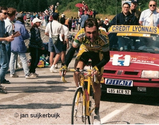 Cuando Miguel cazó a un Zülle que daba muestras de un cansancio insalvable, llegaría el coche de Echavarri y Unzué, quien también proveyó al dorsal uno de la carrera de otro bidón (hubo multas tanto para Banesto como para Gewiss, por alimentar con líquido dentro de la zona en que nos estaba permitido y veinte segundos de penalización al ciclista en la general), pero aquellos más de tres mil metros iban a suponer una auténtica tortura para el quíntuple ganador del Tour.