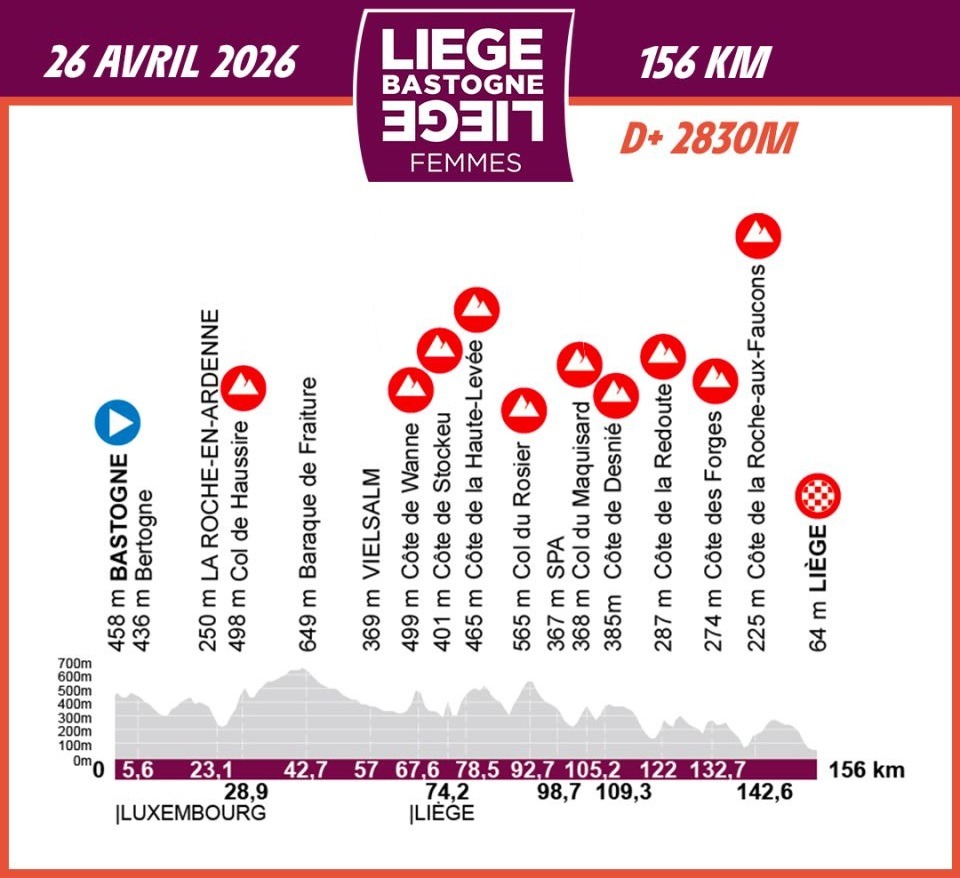 De Bastoña a Lieja, los ciclistas recorrerán 156 kilómetros, siguiendo al pelotón masculino, para coronarse en el Quai des Ardennes. No se escatimarán esfuerzos: en 2026, descubrirán el Col de Haussire, conocido como el puerto más difícil de Bélgica, volverán al tríptico Wanne-Stockeu-Haute-Levée, se enfrentarán al Col du Rosier y se enfrentarán a la combinación sin precedentes de los puertos Maquisard y Desnié… Finalmente, los más valientes se batirán en duelo en las míticas pistas de La Redoute, Les Forges y La Roche-aux-Faucons, antes de triunfar en el corazón de la Cité ardente .