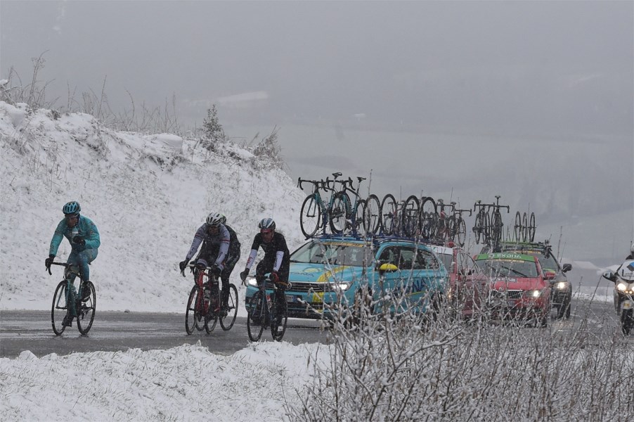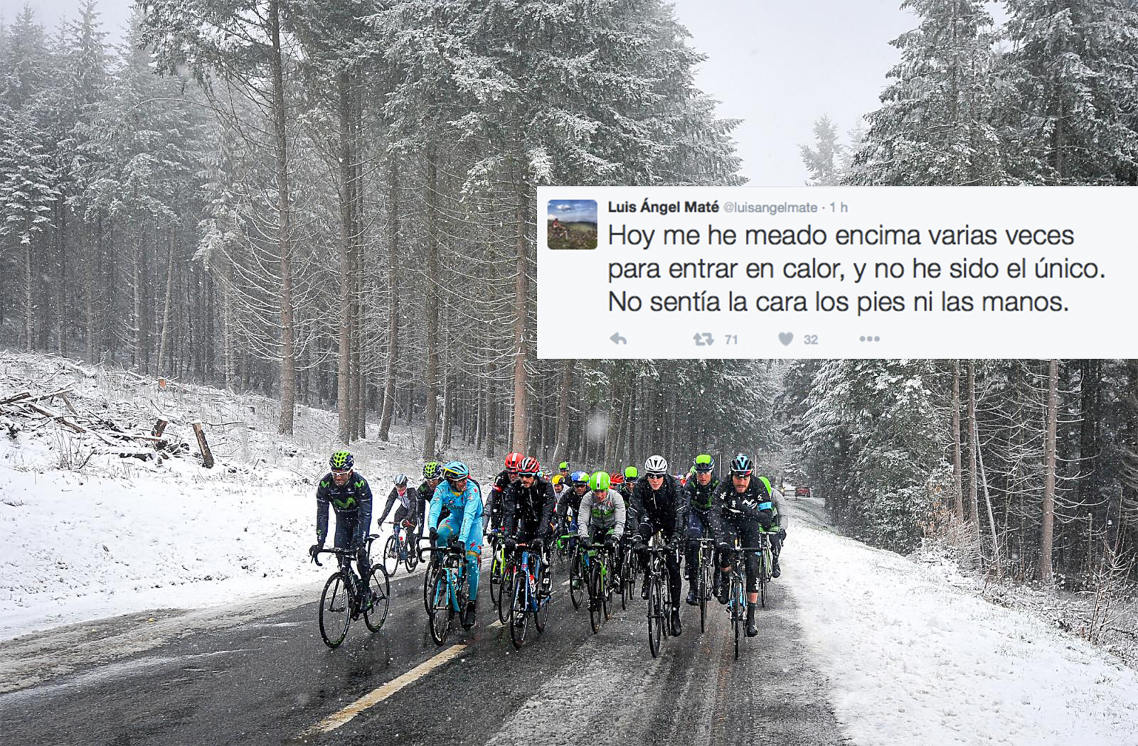 A partir de ese momento, con los ciclistas ya protegidos del frío y la nieve en los coches de los equipos, comenzaron a llegar las reacciones a través de las redes sociales. Quizás, el más expresivo haya sido el español Luis Ángel Maté que desde su cuenta de Twitter decía que hoy se había “meado encima varias veces para entrar en calor”, aunque también añadía que él “no he sido el único”. Para hacernos una idea de las gélidas temperaturas a las que se han enfrentado hoy los corredores, basta con saber que Maté “no sentía la cara, los pies ni las manos”.