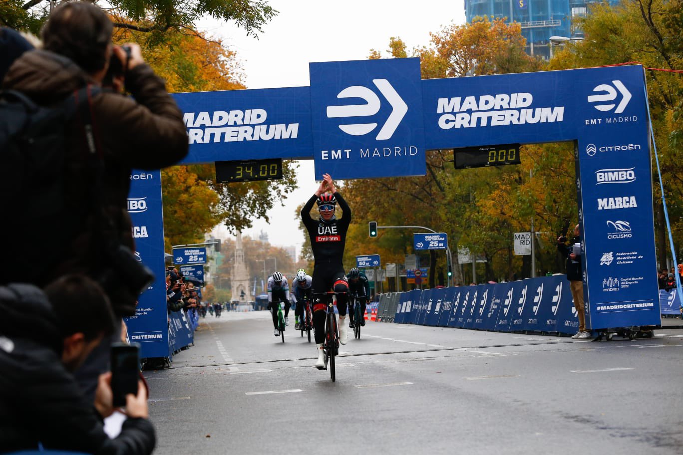 En una mañana algo desapacible en Madrid, con frío, viento y lluvia, el equipo UAE Emirates Team ha demostrado que no ha acudido a la primera edición del Criterium de la capital de España de paseo y dos de sus mejores corredores se han llevado la victoria en las dos pruebas de la mañana, la de puntuación y la de ruta.