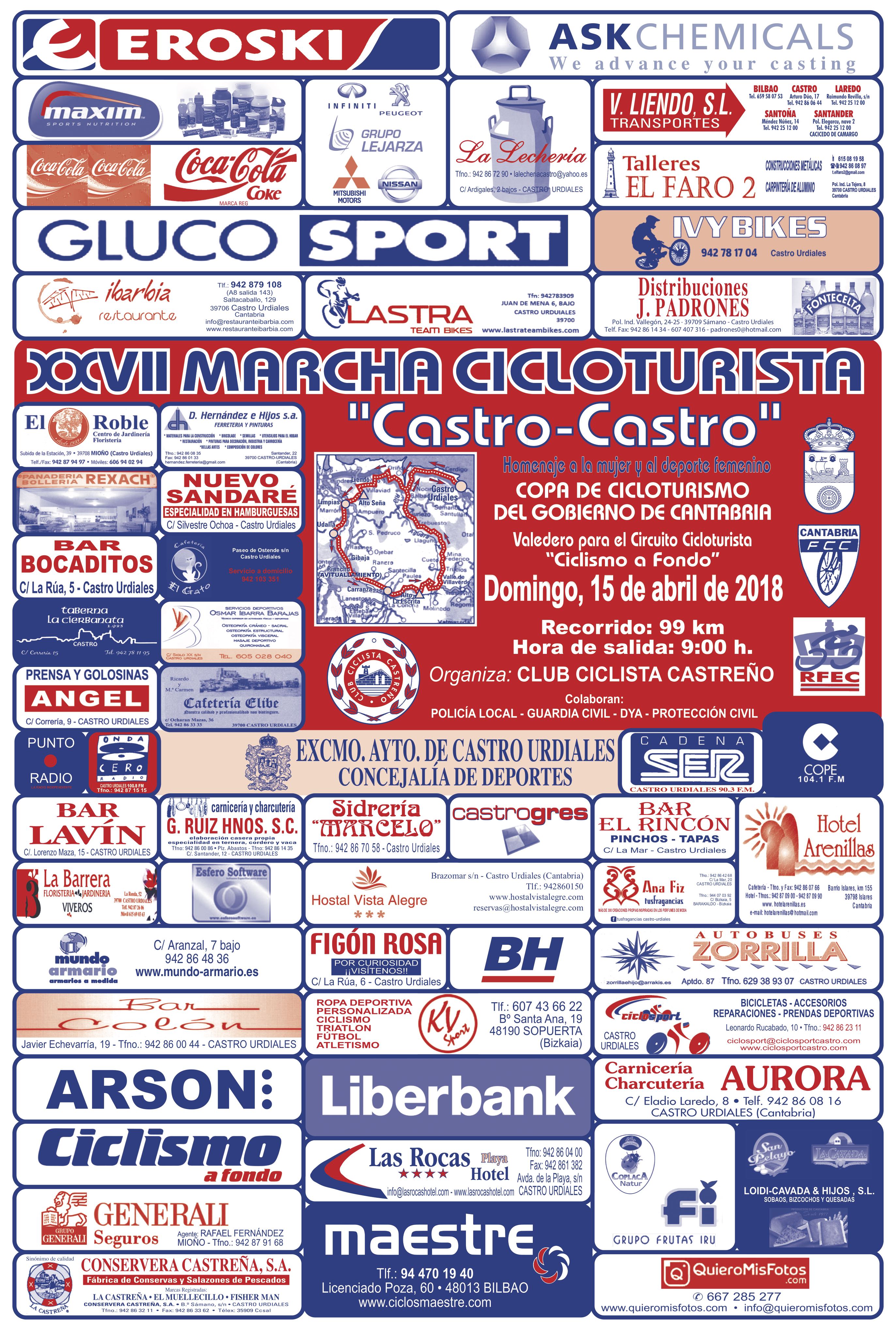 Art.1. La CASTRO-CASTRO es una marcha cicloturista de las reguladas en el artículo 8 del Reglamento de «Cicloturismo-Ciclismo para Tod@s» de la RFEC dentro del marco de una especialidad ciclista que concibe este deporte como un ejercicio físico con fines de ocio, excluyendo la competición. El Club Ciclista Castreño organiza para el Domingo, 15 de Abril de 2018, la EDICION XXVII MARCHA CICLOTURISTA CASTRO CASTRO , con el recorrido y perfil que se representan en el esquema adjunto. El Club Ciclista Castreño, como organización de esta marcha Cicloturista, se reserva el derecho de modificar el recorrido cuando las circunstancias o las autoridades así lo recomienden.