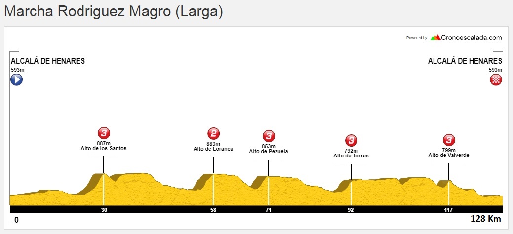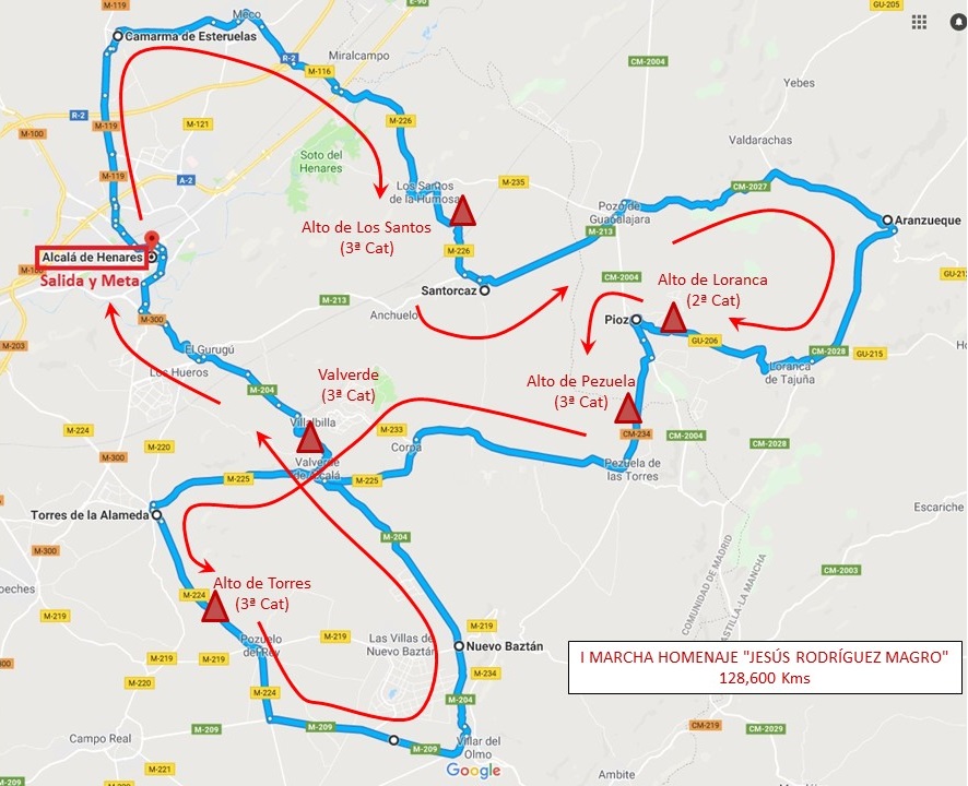 A esa misma hora se dará también inicio a la marcha ciclodeportiva, que se celebrará sobre un recorrido de 120 kilómetros de velocidad libre y que contrará con las ascensiones a Los Santos de la Humosa (3ª), Loranca (2ª), Pezuela (3ª), Torres de la Alameda (3ª) y Valverde de Alcalá (3ª).
