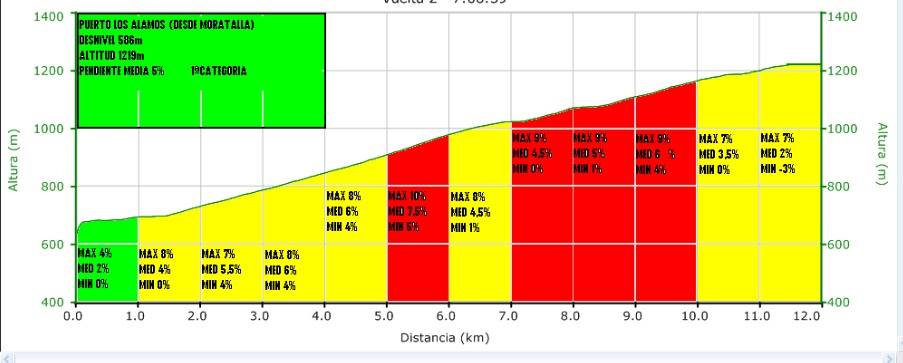 El alto de Los Álamos, común en las marchas de gran fondo y medio fondo, será la primera dificultad montañosa significativa, ubicada en el Kilómetro 30, después del primer paso por Moratalla y el primer avituallamiento. Consta de 12 kilómetros con una pendiente media del 5% y con un desnivel total de 600 metros.