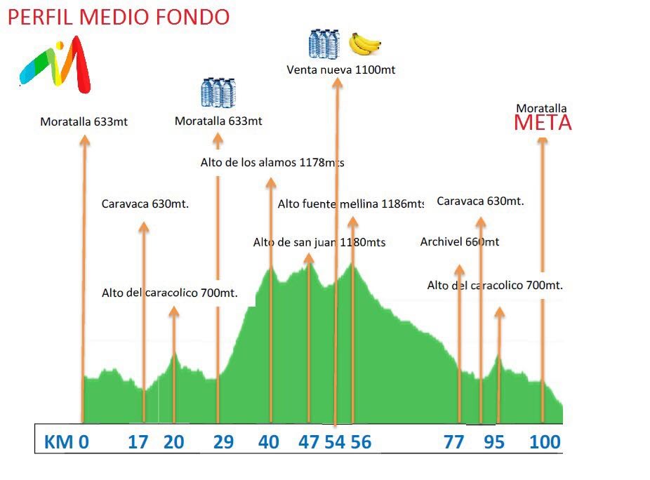 Para la opción de medio fondo se establece una distancia de 100km, con salida y llegada en Moratalla y con un desnivel positivo de 1.400mts. Para la prueba de medio fondo, el recorrido será común al de la prueba de gran fondo, hasta su finalización en el km. 100.