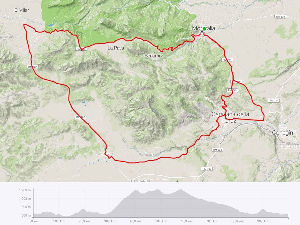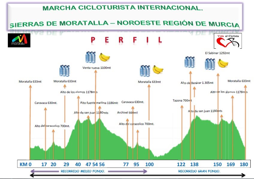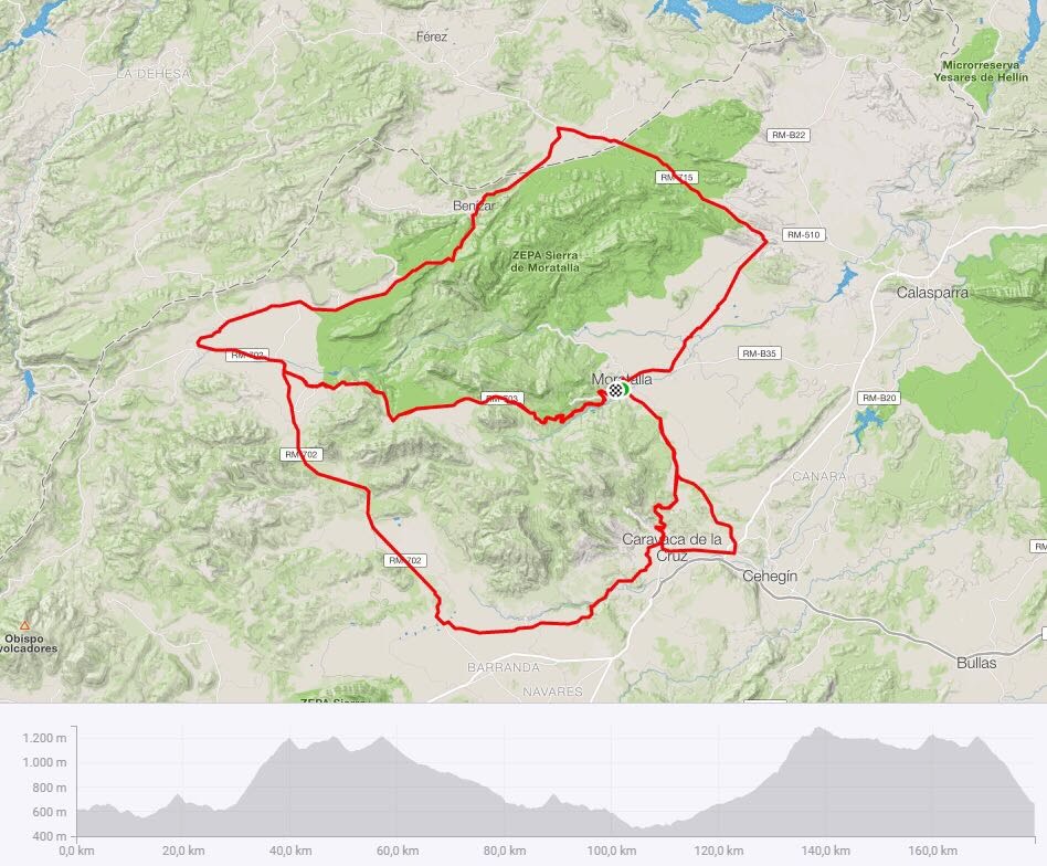 Para la opción de gran fondo se establece una distancia de 180km, con salida y llegada en Moratalla, y con un desnivel positivo de 2.600 mts