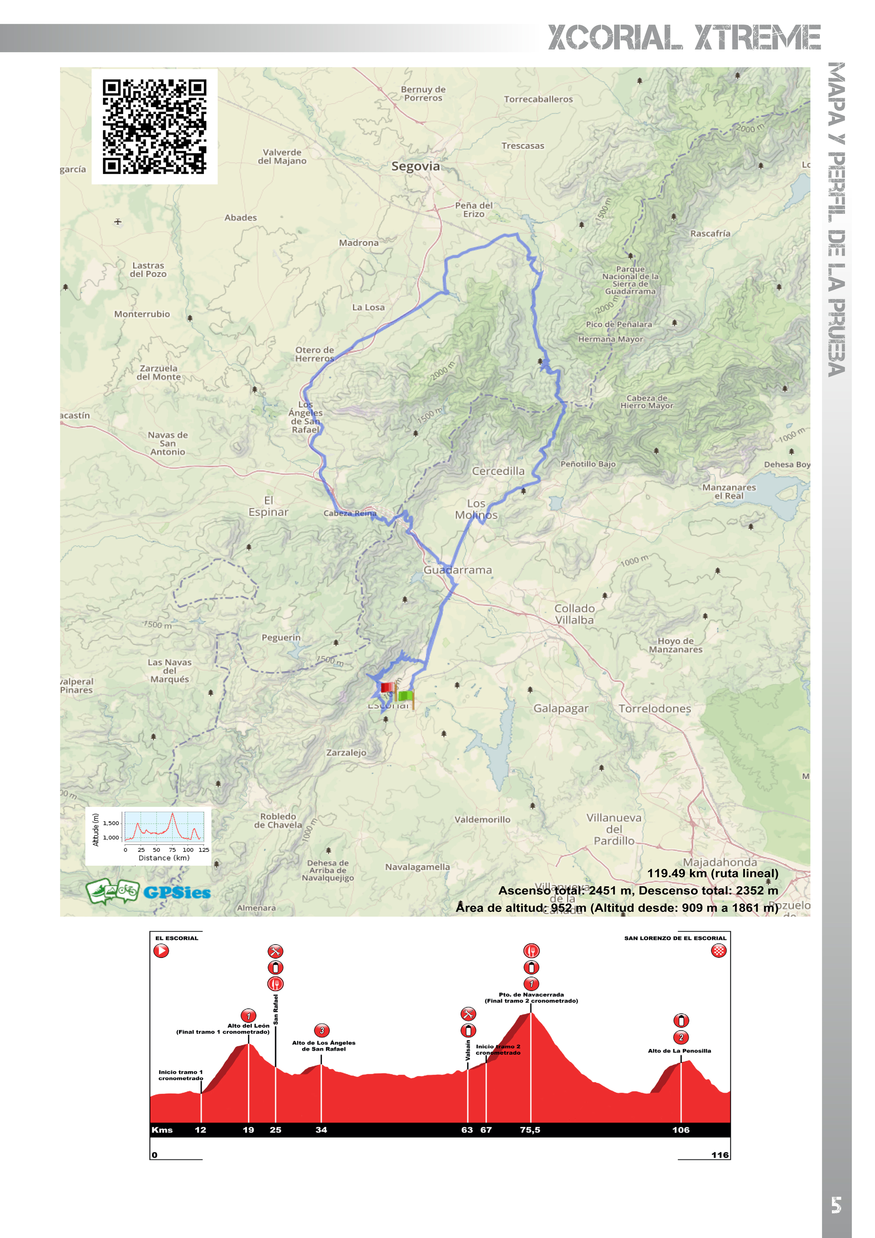 La mañana del 29 de septiembre partirán los inscritos desde la plaza del Ayuntamiento de El Escorial para afrontar esta segunda edición de la Marcha Xcorial Xtreme. La prueba tendrá un trazado de 116 kilómetros y las cimas montañosas de El Alto del León, Los Ángeles de San Rafael, Navacerrada por el lado segoviano, también conocido como 7 revueltas, y la Penosilla, siendo esta última una espectacular subida de 3 kilómetros, desconocida para muchos ciclistas, con desniveles positivos entre el 6 y el 9 por ciento, además de zonas de sterrato. Para finalizar en el Real Monasterio de San Lorenzo de El Escorial, tras haber acumulado un total de 2.500 metros de desnivel positivo. “La Penosilla es la seña de identidad de nuestra Marcha, al ser un puerto desconocido por la mayoría de ciclistas, los cuales se sorprenden gratamente cuando lo suben. Y no descarto que algún día esta cima sea final de La Vuelta”, manifestaba el director de la Xcorial Xtreme, Victorino López.