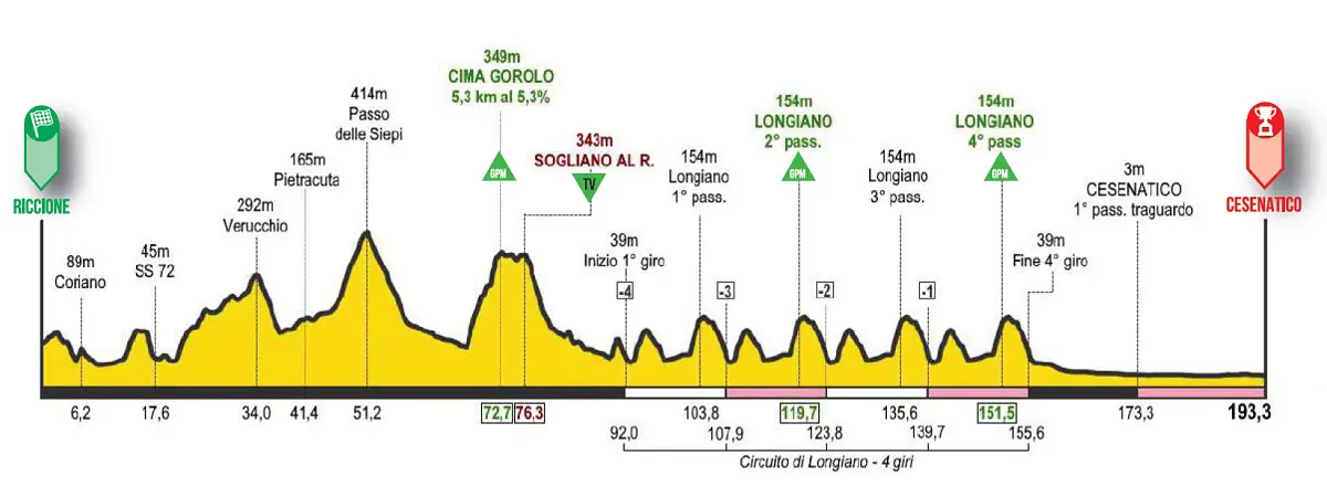 El GS Emilia, organizador de la carrera, ha preparado para el sábado 16 de septiembre un recorrido de 193,3 kilómetros con salida en Riccione y meta en Cesenatico, lugar de nacimiento del ídolo desaparecido. Tras las primeras subidas y bajadas de Verucchio, Passo delle Siepi y a la Cima Gorolo, se llega al circuito de Longiano -que sustituye al de Montevecchio-, punto clave de la carrera con un recorrido de 15,9 km que tendrán que repetir en cuatro ocasiones. Ya en su recta final, la prueba se dirigirá hacia Cesenatico, donde habrá un primer paso por la línea de meta para entrar en el último circuito de 5 kilómetros que se repetirá cuatro veces.