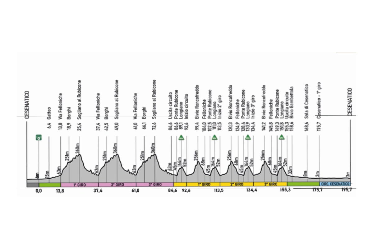 El pelotón deberá afrontar 195,7 kilómetros con un desnivel total superior a los 2500 metros, concentrado sobre todo en las tres ascensiones del día: Sogliano al Rubicone, Longiano y el Bivio di Roncofreddo. Estas subidas se encadenarán varias veces dentro de los dos circuitos de la primera parte de la prueba, garantizando una selección previa y terreno para los ataques de los escaladores y clasicómanos. Sin embargo, la resolución volverá a producirse en el circuito final de Cesenatico, completamente llano y muy favorable para los equipos con hombres rápidos, que intentarán reorganizarse tras la montaña y preparar una llegada masiva.