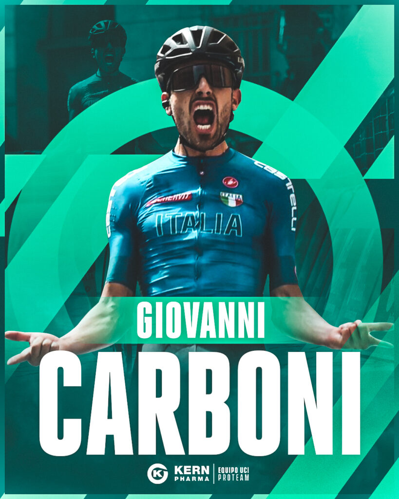 Giovanni Carboni (Fano, 1995) dio el salto al profesionalismo en 2018 con la formación italiana Bardiani-CSF, en la que permaneció durante cuatro temporadas hasta fichar por el Gazprom-RusVelo. Desde marzo, y a causa de la disolución del conjunto ruso, el ciclista de Fano compitió con los colores de la Selección Italiana, llegando a alzarse con la victoria en la tercera etapa de la Adriatica Ionica Race. Con tres Giro de Italia en sus piernas y varios resultados destacados en pruebas de gran nivel, Carboni recala en el Equipo Kern Pharma para seguir progresando.
