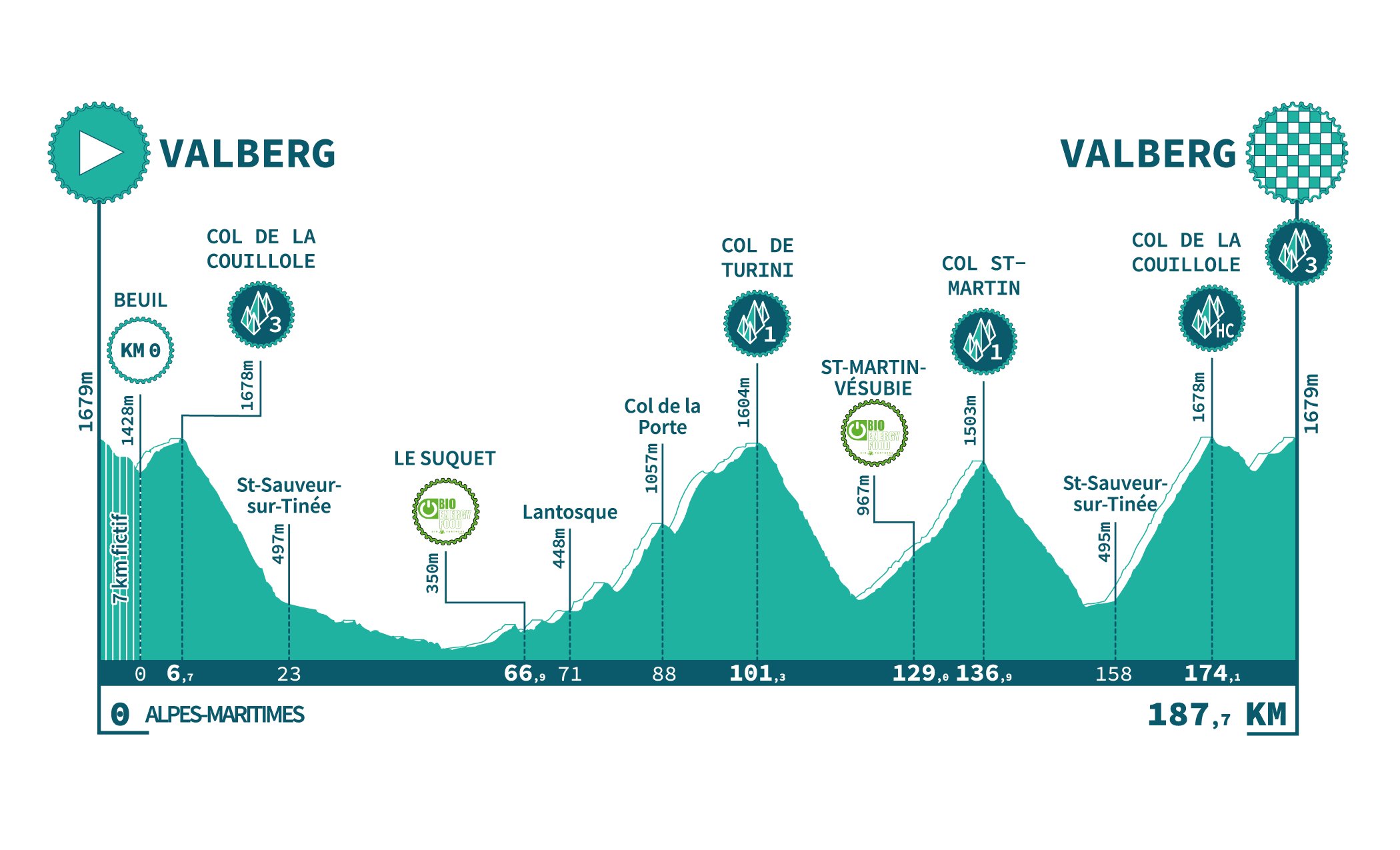 Comenzará y llegará a Valberg, una de las estaciones de esquí más importantes del sur de los Alpes, ubicada a 1.700 metros sobre el nivel del mar, a las puertas del Parque Nacional Mercantour. En el transcurso de los 187,7 kilómetros planeteados atravesarán seis puertos: Col de la Cuillole, Col de la Porte, Col de Turini (presente en la próxima edición del Tour de Francia), Col Saint-Martin-La Colmiane regresando de nuevo, y última vez, al Col de Cuillole antes de volver a Valberg.