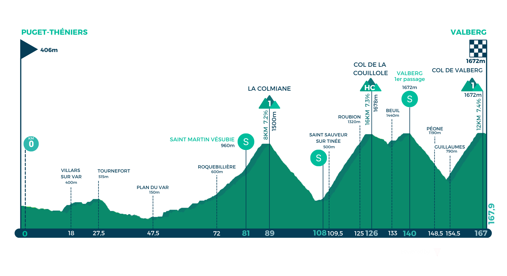 El ascenso a La Colmiane fue más tranquilo, pero en las primeras rampas del Col de la Couillole, Israel-Premier Tech se puso en cabeza y comenzó a seleccionar qué hombres disputarían la victoria final. En las exigentes rampas del puerto de categoría especial el grupo se echó encima de la escapada, donde tan solo Ferron, Verre y Schönberger resistían con poco más de un minuto de ventaja. La caza acabó de materializarse una vez entró al comando del grupo el equipo Groupama-FDJ.
