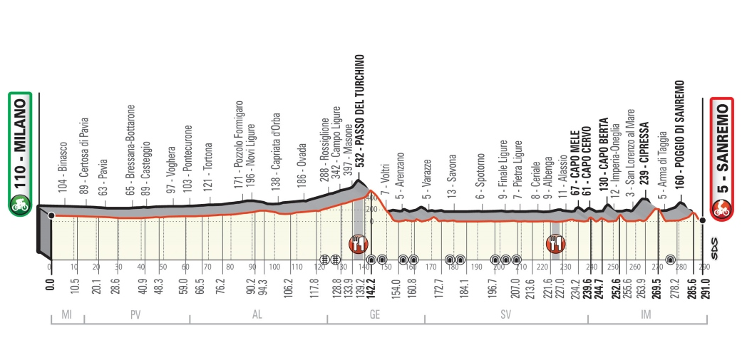 Nada hacia presagiar un desenlace tan espectacular. La Milán-San Remo partió del Castello Sforzesco en Milán a las 9.45 horas después de la tradicional ceremonia de presentación de los equipos, aunque no fue hasta las 10.15 horas cuando se dio el banderazo oficial al primer Monumento de la temporada. Un total de 291 kilómetros (más de 300 sumando el tramo neutralizado) separaban a los 175 participantes de la Via Roma en San Remo.