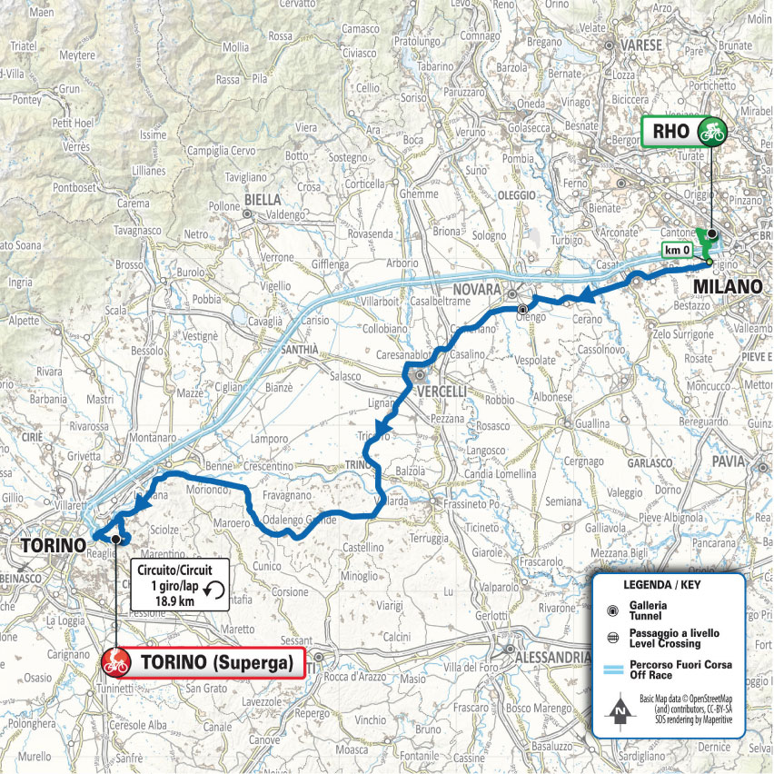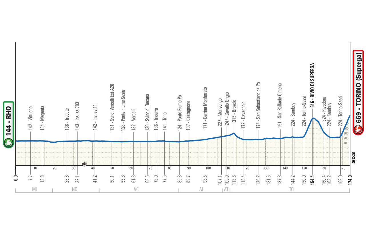 El recorrido es esencialmente plano en la primera mitad, ondulado con algunos baches notables en la segunda. Comenzando en Rho , la ruta cruza el valle superior del Po en carreteras llanas en la zona de arrozales, pasando por Magenta , Novara y Vercelli, antes de dirigirse hacia el río Po, cruzando arrozales perfectamente planos. Sigue un tramo ondulado, por carreteras anchas y mayormente rectas, hasta llegar al circuito final. Después de San Mauro Torinese, la ruta sigue el río Po en Corso Casale, subiendo a la Basílica de Superga por primera vez (un desvío 600 metros antes de la línea de meta), antes de descender a Rivodora con un desafiante descenso de regreso a San Mauro, antes de volver a subir a la línea de meta con pendientes que a veces superan el 10%.