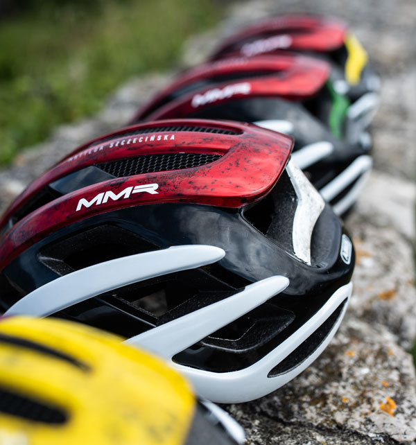 El blanco, base del diseño del modelo de MMR, queda rematado con acabados mármol para integrar los colores de las banderas nacionales de las cuatro corredoras mundialistas. Igual sucede con los cascos Abus Airbreaker personalizados para la ocasión