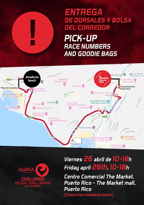 La recogida de dorsales se realizará el viernes, 26 de abril, de 10:00 a 18:00 horas en el Centro comercial The Market Puerto Rico. Paralelamente a la celebración de la prueba tendrá lugar la Feria Challenge Mogán Gran Canaria, la Tri Expo, que estás abierta a todas las empresas, instituciones y otras organizaciones que ofrezcan productos y servicios de interés para los participantes y visitantes del evento. Se ubica a 200 metros de la zona de salida y llegada, en el paseo marítimo de Amadores.