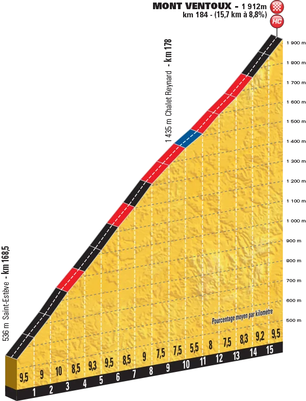 Altimetrías interactivas del Mont Ventoux, puerto francés puntuable de categoría especial en el Tour de Francia.