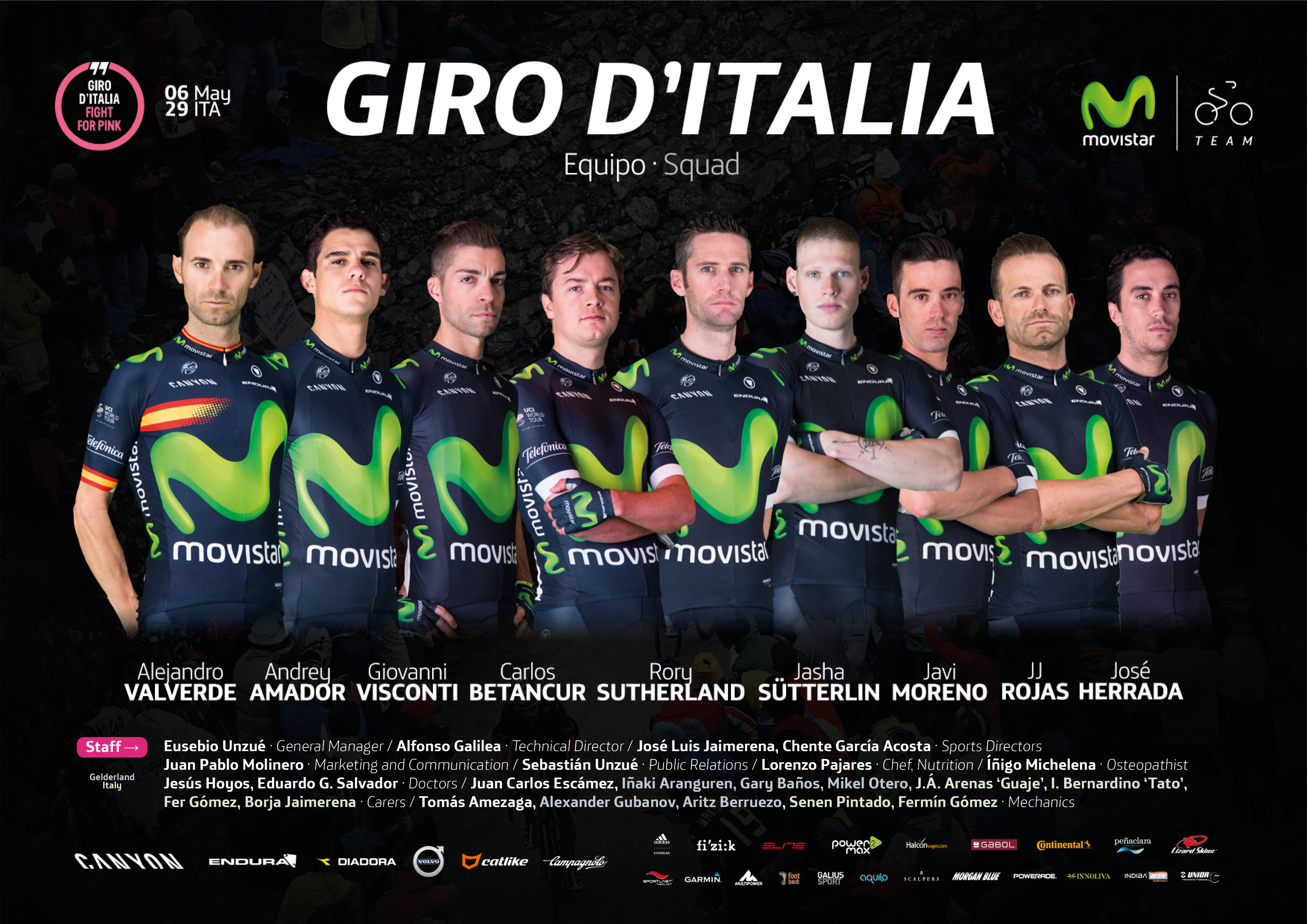 Movistar confirma la alineación que la escuadra española presentará este viernes en Apeldoorn (Países Bajos) durante la salida del 99º Giro de Italia. José Luis Jaimerena y Chente García Acosta dirigirán al conjunto de Eusebio Unzue, capitaneado por el campeón de España, Alejandro Valverde y que completan el costarricense Andrey Amador, el italiano Giovanni Visconti, el colombiano Carlos Betancur -que no estaba preseleccionado-, el australiano Rory Sutherland, el alemán Jasha Sütterlin y los españoles Javi Moreno, José Joaquín Rojas y José Herrada.