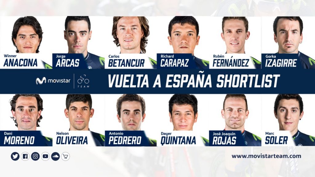 Movistar anuncia hoy miércoles una lista de doce candidatos para ocupar las nueve plazas de que dispondrá la escuadra en la Vuelta a España 2017, que arranca el próximo 19 de agosto en la localidad francesa de Nîmes con la sensible baja de Alejandro Valverde, convaleciente de sus lesiones tras la caída en la 1ª etapa del Tour de Francia.
