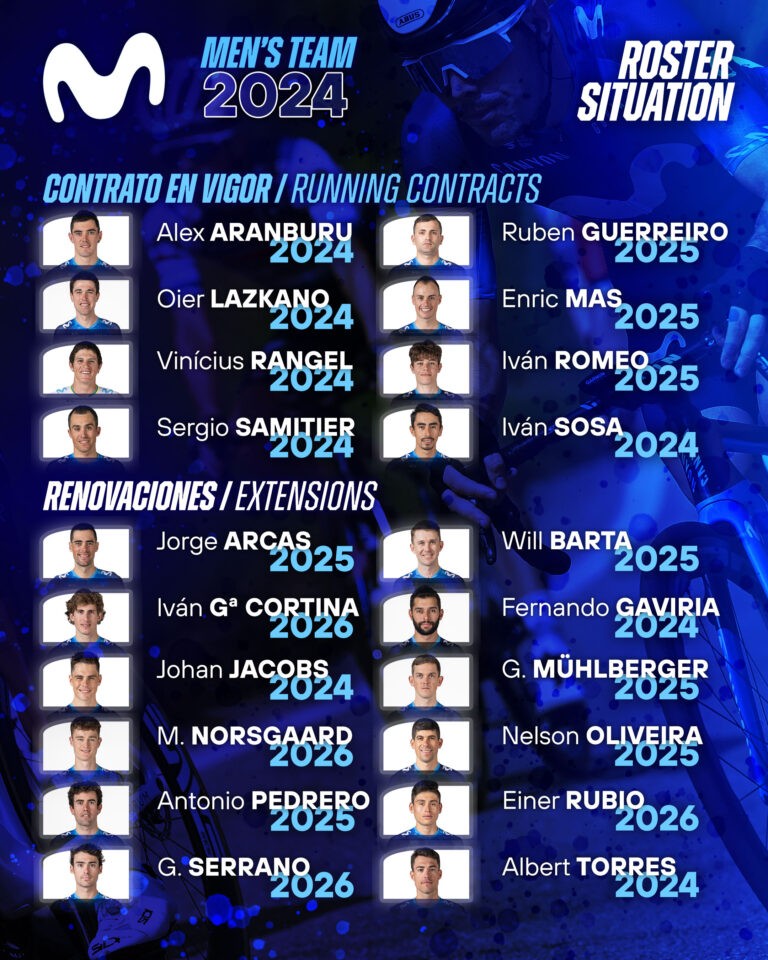 En esta plantilla de 20 corredores -a falta de conocer los fichajes- destaca la ausencia de José Joaquín Rojas, Juri Hollmann, Óscar Rodríguez, Abner González y Lluís Mas cuyos contratos expiraban en este 2023. Los cinco no han sido renovados por Movistar, en un movimiento que los sitúa en el mercado de fichajes a la espera de encontrar nuevo destino. Tampoco están presentes Imanol Erviti que anunció su retirada esta semana, Matteo Jorgenson que se va a Jumbo, Carlos Verona que hace las maletas a Lidl, Max Kanter que llega a Astana y Gorka Izagirre que se marcha a Cofidis, siendo diez los corredores que dejan su plaza libre en el equipo español.