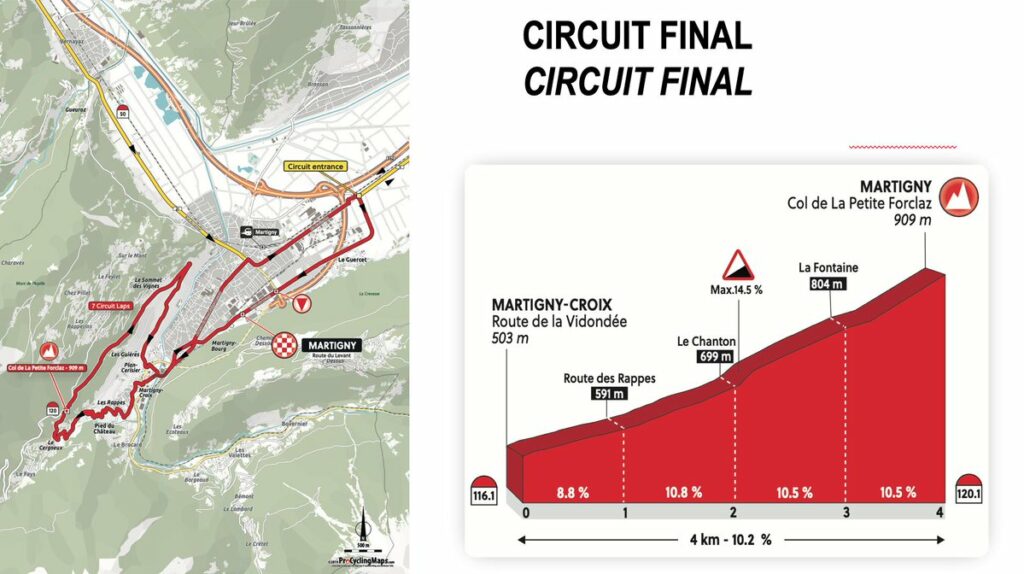 Si se eligiera esta configuración, se parecería menos a Martigny (siete veces el Col de la Petite Forclaz, 4 km al 10%) que al circuito austriaco de Innsbruck en 2018, donde los corredores habían girado seis veces sobre la misma cima antes de afrontar el duro repecho que conducía al descenso a meta.