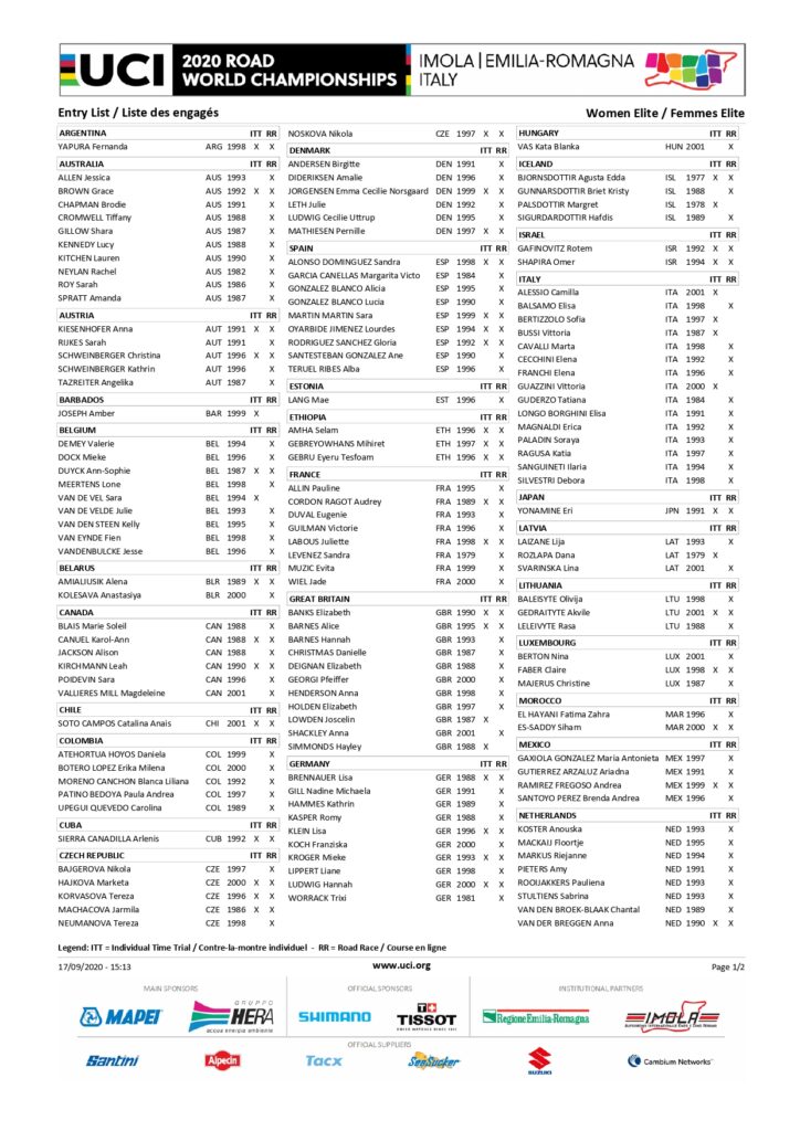 Campeonato del Mundo de Ruta UCI 2020 – Lista de inscritos – Naciones