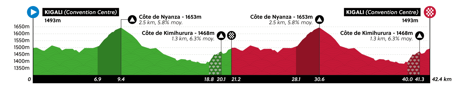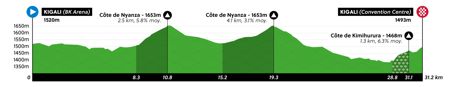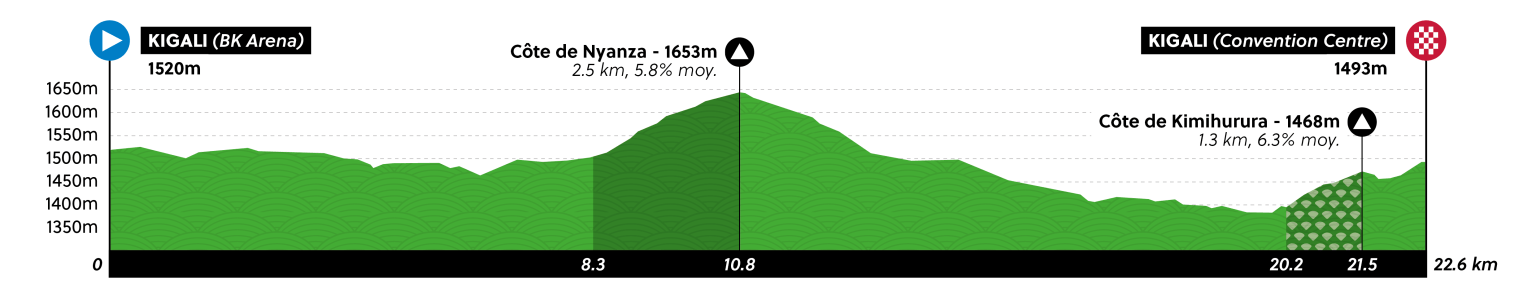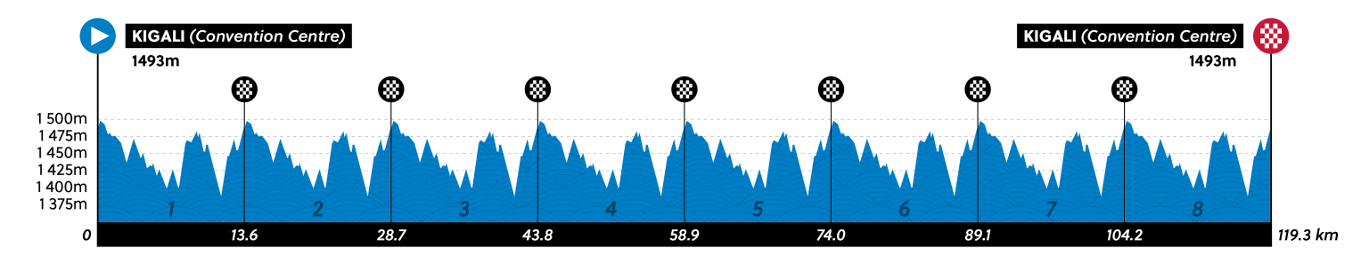 La meta y salida estará en la capital del país y entre ellas un primer circuito de 15.100 metros (135 kilómetros) que se recorrerá en nueve ocasiones. La subida del Kigali Golf (800 metros al 8,1%) y Kimihurura (1,3 km al 6,3%) serán sus dificultades.