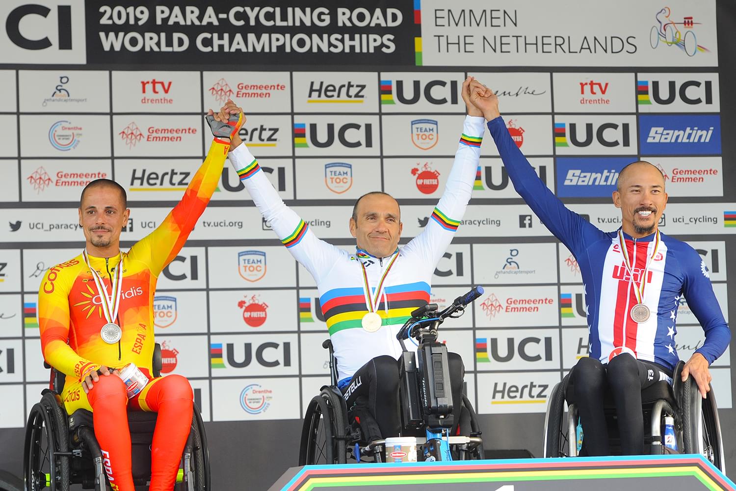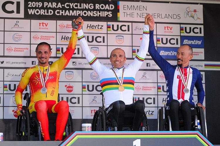 Un arcoíris y dos medallas más, una de plata y otra de bronce, es el botín de la Selección Española en un día que pasará a la historia del ciclismo adaptado nacional. Ricardo Ten, encuadrado en la clase C1, se ha proclamado campeón del mundo mediante una actuación épica, inolvidable, que le ha llevado a batir a todos los ciclistas de su categoría, así como a los de la C2 y C3, gracias a un ataque en la vuelta final que le ha permitido entrar victorioso en solitario. Una imagen emocionante, la del valenciano cruzando el arco de meta triunfador, que quedará para el recuerdo de todos los presentes. “Ganar así ha sido muy bestia. Me he emocionado y todo”, contaba Ricardo Ten, con los sentimientos a flor de piel, tras bajar del podio y recoger el preciado maillot de campeón del mundo.