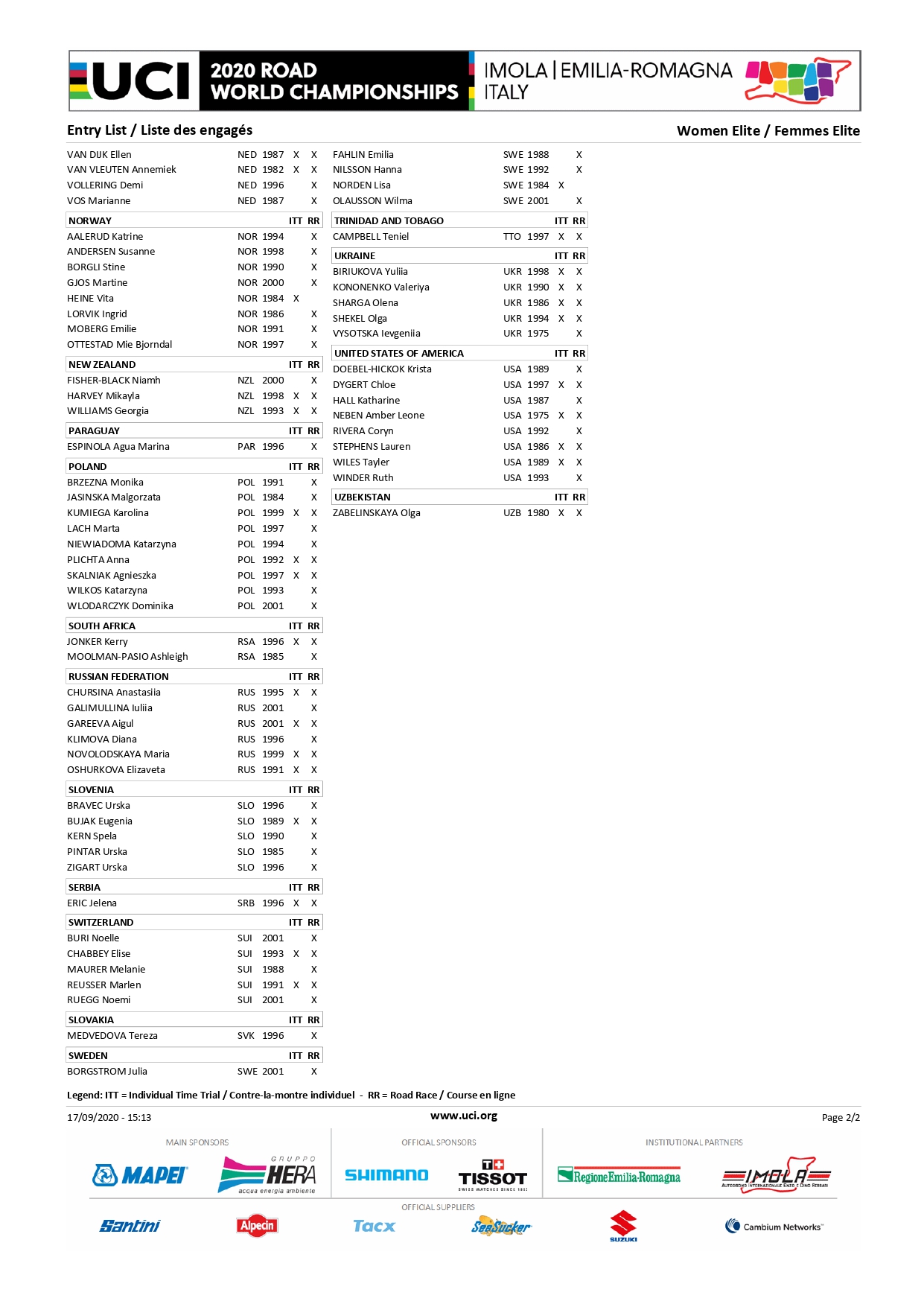 Campeonato del Mundo de Ruta UCI 2020 – Lista de inscritos – Naciones