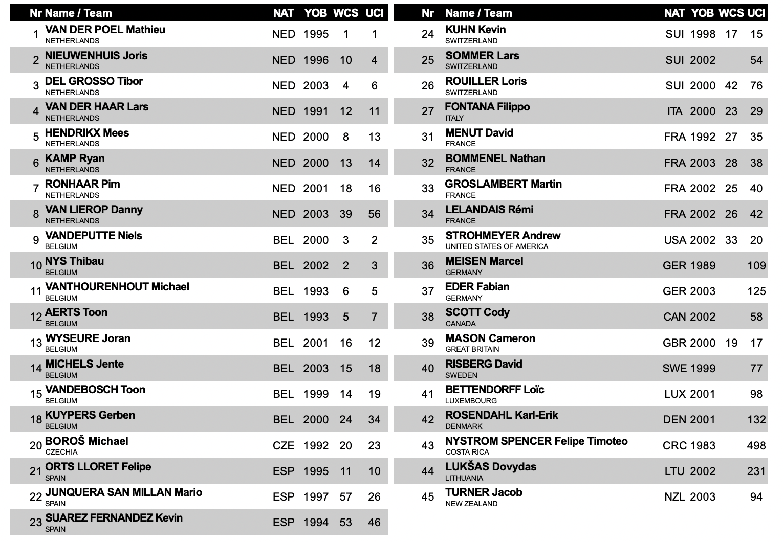 (*) Si un belga gana la Copa del Mundo 2025-2026, habrá una novena plaza que se otorgará a uno de los siguientes corredores: Anton Ferdinande, Wout Janssen, Witse Meeussen o Victor Van de Putte