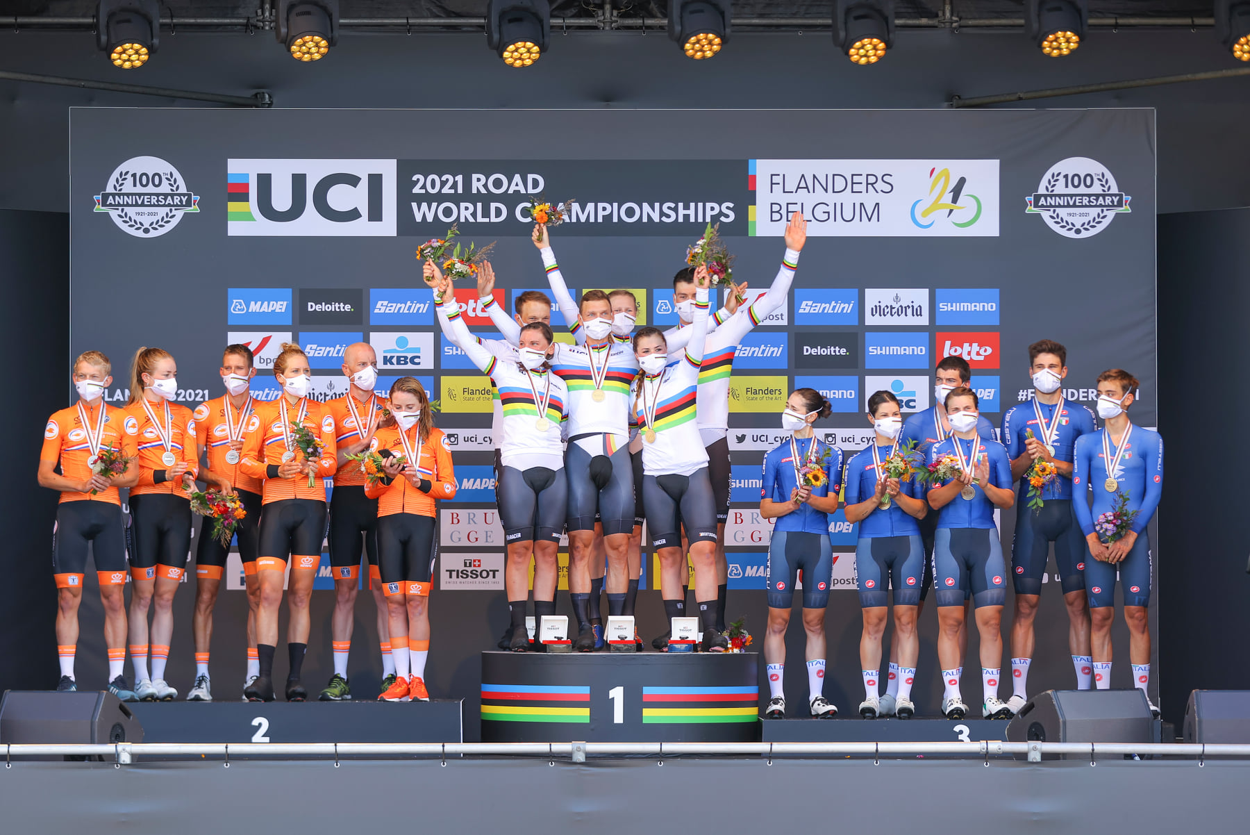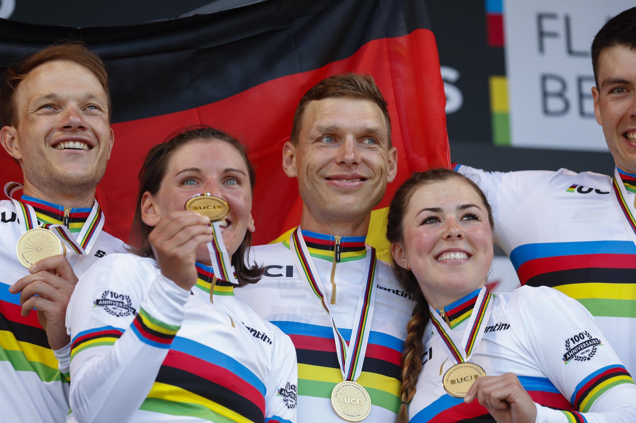 La selección alemana es la nueva campeona del mundo en la prueba contrarreloj por relevos mixta, sucediendo a Países Bajos, primer vencedor de esta novedosa prueba creada en 2019. El cuádruple maillot arcoíris en la categoría individual, Tony Martin, se retira de esta forma, colgándose una última medalla de oro en la disciplina que dominó durante tantos años. El resto del equipo lo conformaron Nikias Arndt, Max Walscheid, Lisa Brennauer, Lisa Klein y Mieke Kröger. Los germanos batieron a los Países Bajos por apenas 12 segundos, cuyo bloque femenino, liderado por Ellen Van Dijk y Annemiek Van Vleuten, estuvo a punto de lograr la remontada, tras perder 42 segundos en el momento del relevo.