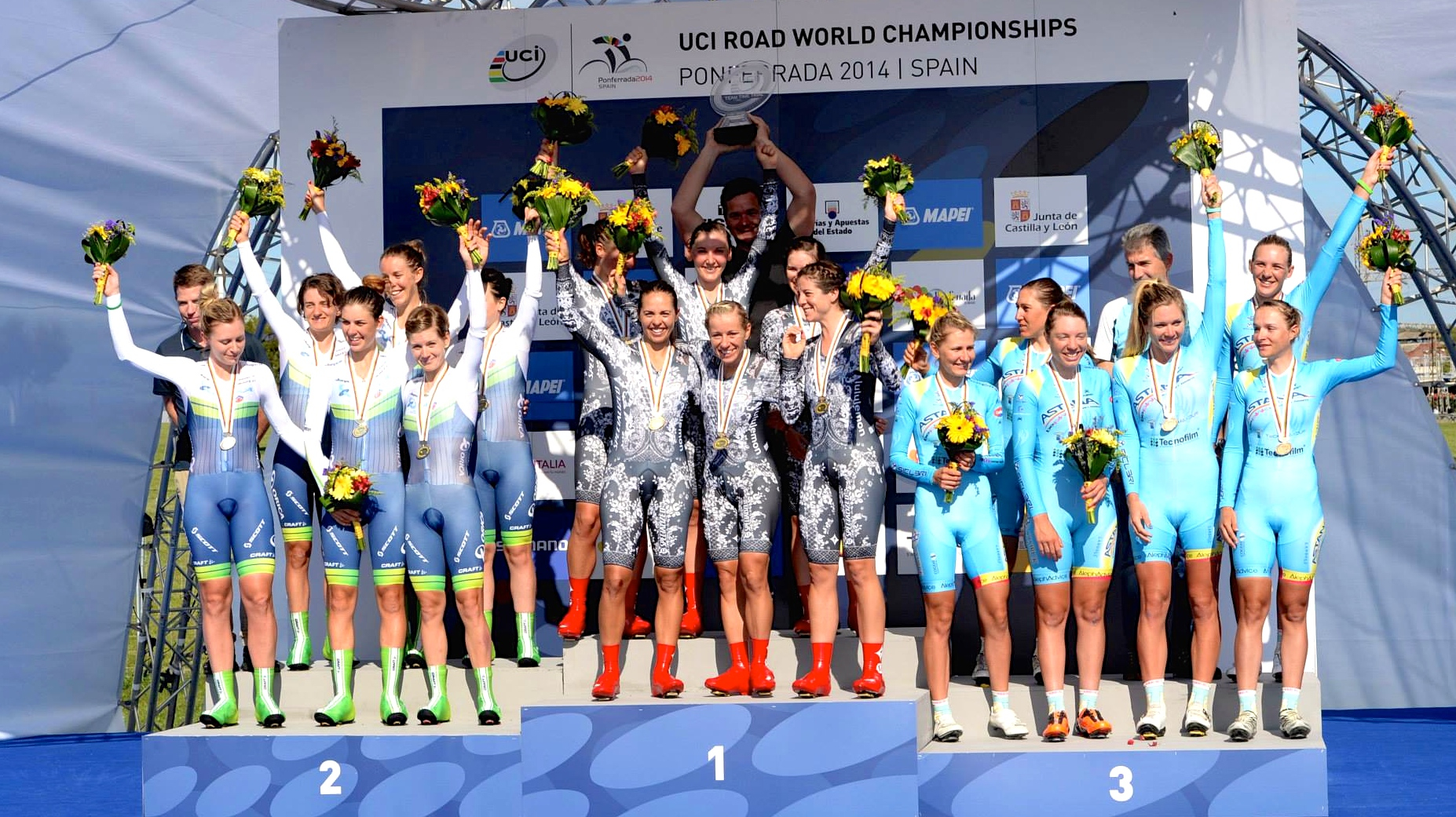 Tres de tres para el equipo estadounindense Specialized Lululemon con su tercer oro consecutivo en el Mundial contrarreloj por equipos en la prueba que abrió los Mundiales de Ponferrada. La holandesa Blaak, las alemanas Brennauer y Worrack, la canadiense Canuel y las estadounidenses Stevens -magullada por una caída el día anterior- y Small son las portadoras del maillot arcoíris hasta la cita de Richmond en 2015.