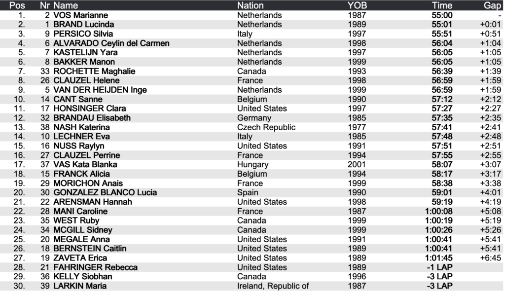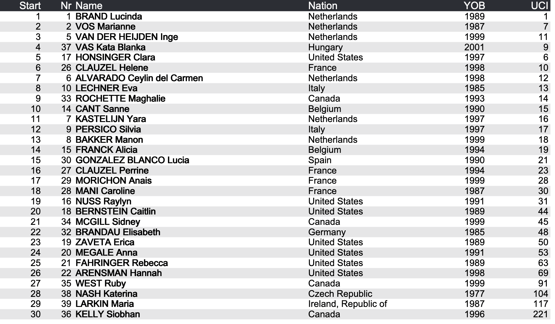 Tras unas vueltas de marcaje absoluto, en ocasiones de estilo pistard, Vos quiso probar las fuerzas de una Brand quizás demasiado conservadora y tratando de poner un sólido ritmo que Vos no tuvo problemas. Pero Brand –ganadora de la Copa del Mundo 21-22– no se arredró y aguantó todos los envites. Así ambas se presentaron en la seca recta de Arkansas en la que Vos no tuvo apenas resistencia para ampliar su dorada colección. Ya tiene ocho.