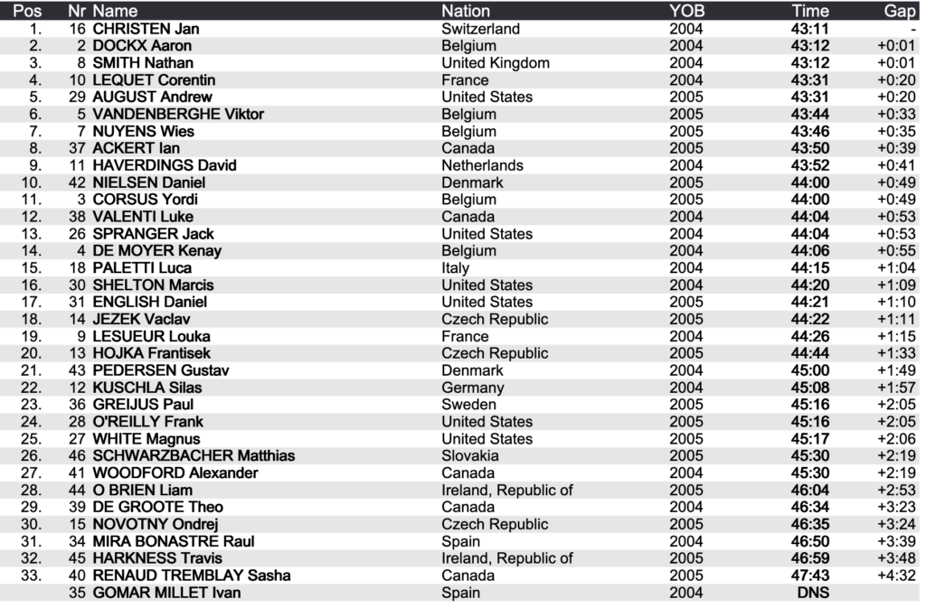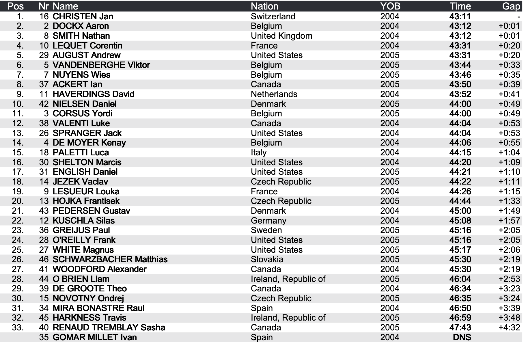 Smith, David Haverdings (Países Bajos), Dockx, el local Frank O’Reilly y Corentin Lequet (Francia) fue el primer grupo en conformarse hasta que Christen avisó junto a los también estadounidenses Magnus White y Jack Spranger. Haverdings, el gran favorito y 9º en meta, sufrió una caída que le alejó de la cabeza al igual que Spranger y Christen, quedándose en cabeza Andrew August, Smith y Dockx y Lequet.