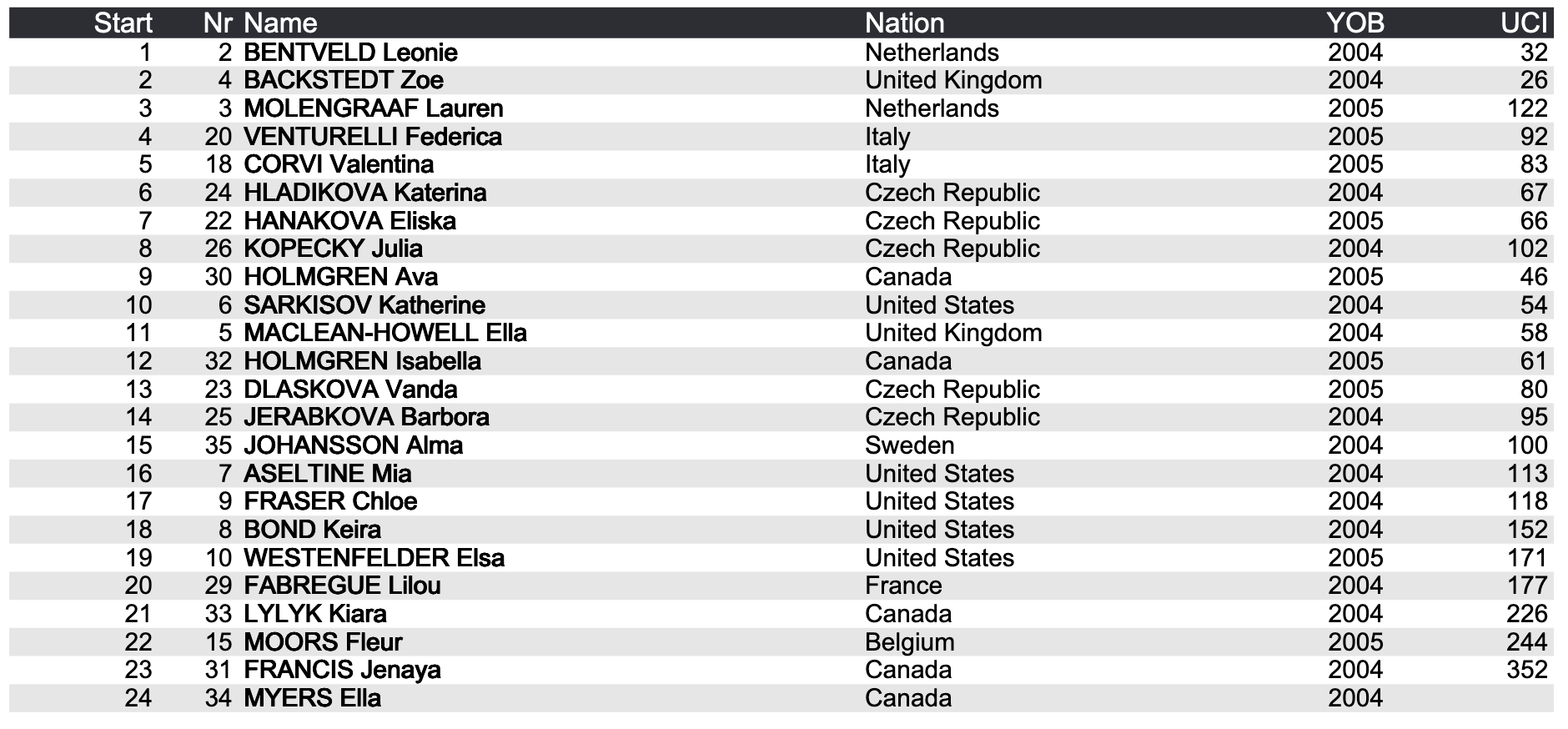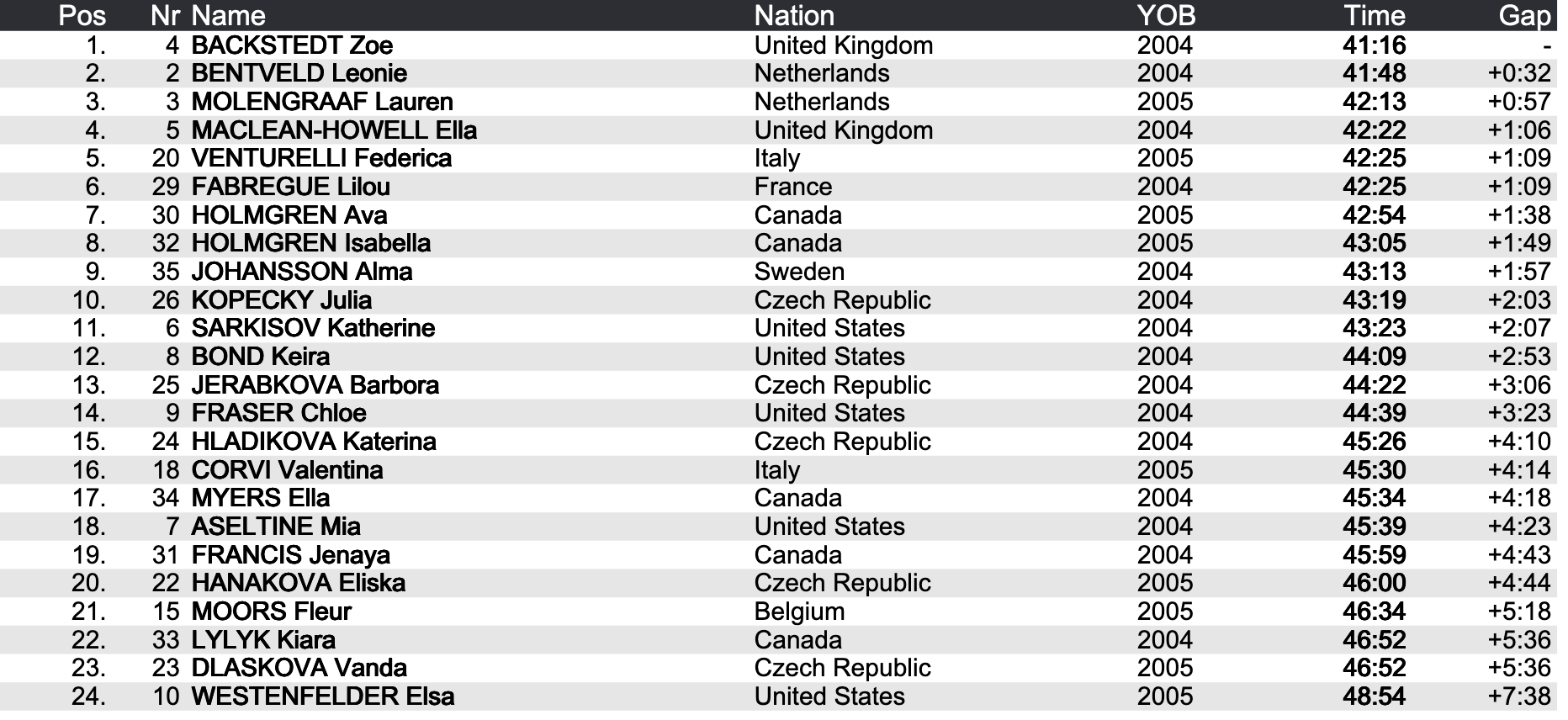 La británica e hija del exprofesional sueco Magnus encadenó su oro ciclopedestre con el de fondo en carretera en Flandes el año pasado de principio a fin sin dejar opción a sus contrincantes. Las neerlandesas Leonie Bentveld y Lauren Molengraaf la acompañaron en el podio final en una prueba que no tuvo participación española.