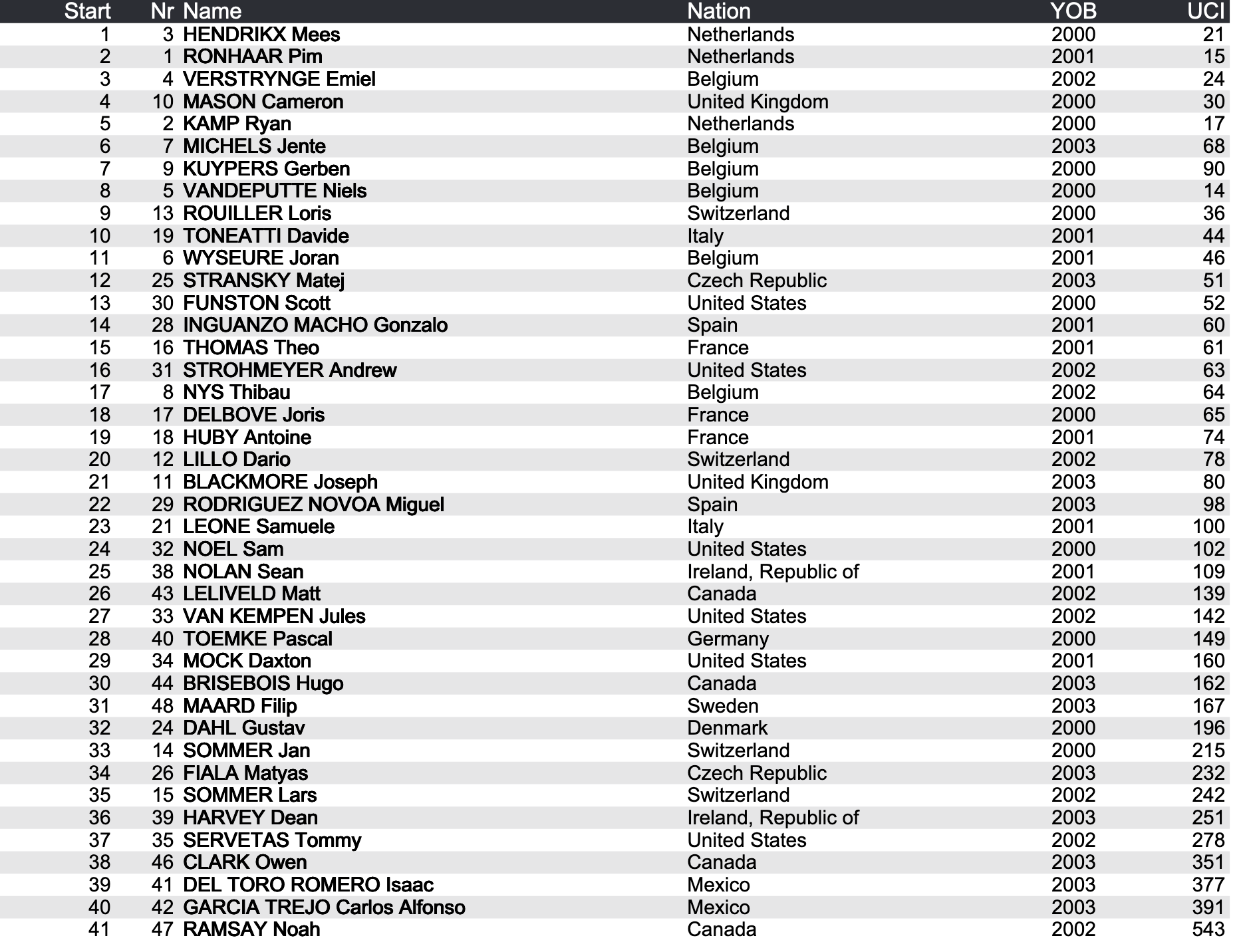 En la vuelta, Emiel Verstrynge atacó adelantando a Hendrikx, Mason, Thibau Nys y Ryan Kamp asegurando la plata, mientras que Nys fue ekl más ápido por el bronce ante Mason y Hendrikx.