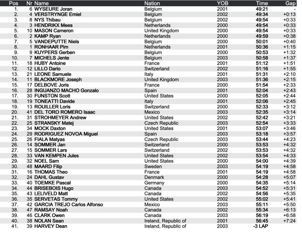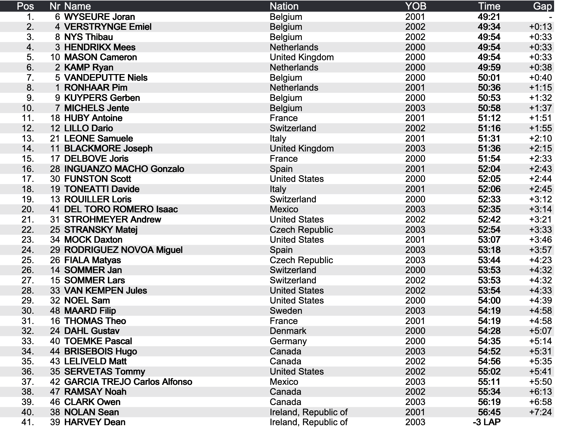 Wyseure fue el primero en atacar y logró mantener la diferencia gracias a la vigilancia de sus compañeros sobre los impotentes neerlandeses Mees Hendrikx, Ryan Kamp y Pim Ronhaar -campeón 2021 que nada pudieron hacer por doblegar a sus vecinos meridionales Ronhaar, el defensor del título, sólo 8º. Hendrikx fue el gregario de los Países Bajos mientras que los belgas y el británico Cameron Mason se mantuvieron expectantes después de una fulgurante salida de un Gonzalo Inguanzo -6º en la primera vuelta- que fue a menios. A pesar de ello Wyseure cogió su ritmo y no cejó en ningún instante en una particular contrarreloj