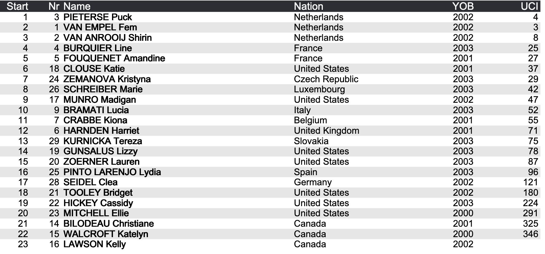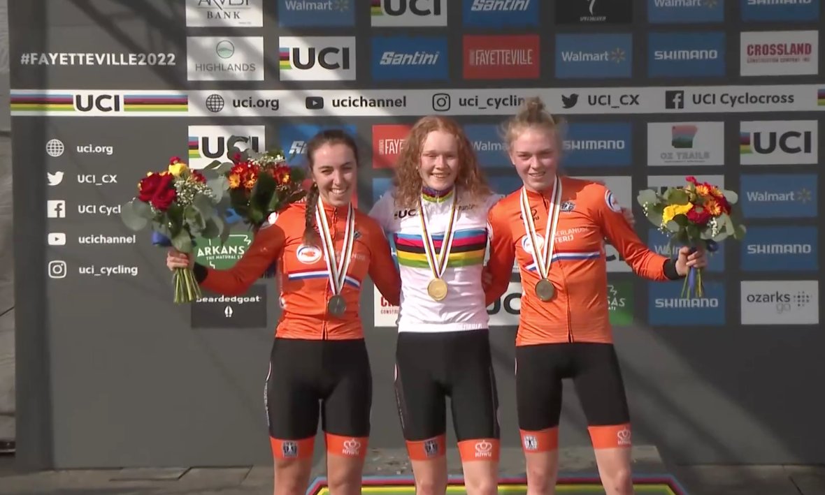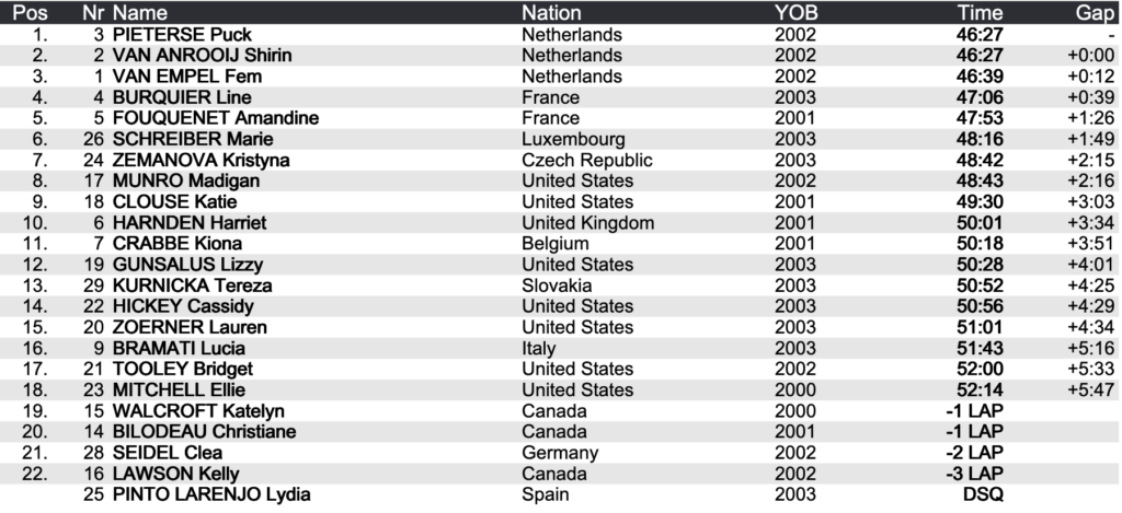La gala no pudo más y mientras Van Anrooij y Pieterse iban vigilándose mientras vieron como llegó su compañera Van Empel. Quedaba saber el orden del podio pero Van Empel tropezó con Pieterse en una subida, se cayó y permitió que sus dos rivales tomaran la ventaja definitiva. En el sprint final Pieterse demostró su mejor punta de velocidad para vestirse con el arcoíris en otro monólogo naranja.