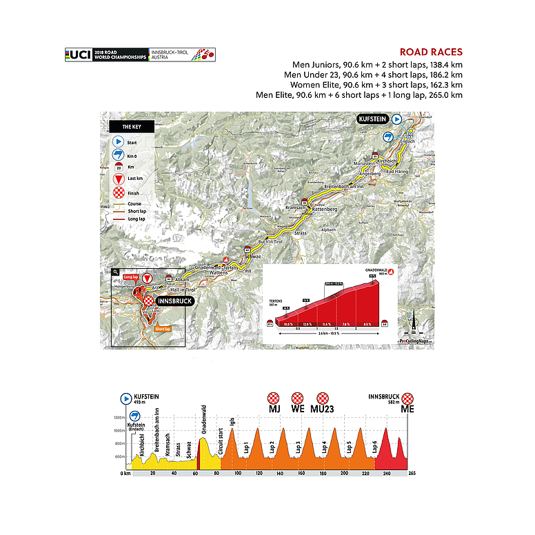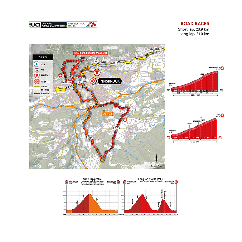 El parque de aventuras Area 47, en Ötztal, será el escenario de partida de las dos cronos por equipos. Tanto hombres como mujeres tendrán el mismo recorrido en sus primeros 40 kilómetros, para después variar desde Kematen, donde las féminas seguirán recto a meta para completar 53,8 kilómetros, mientras que los hombres tendrán que ascender las rampas de hasta el 10% de Mittelgebirge, como peaje previo antes de completar los 62,1 kilómetros que se cerrarán en Innsbruck.