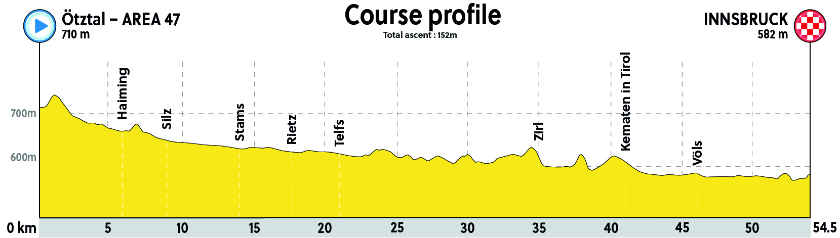 Para esta ocasión, la prueba por equipos femenina se disputará sobre una distancia de 54,5 kilómetros con salida en Ötzal (700 metros de altura) y llegada en Innsbruck (582 metros de altura). Se trata, como se puede deducir por la tendencia descendente de la jornada, de un circuito tremendamente rápido en el que la ausencia de curvas realmente complicadas beneficiará, como debe ser en estos casos, a las grandes especialistas.
