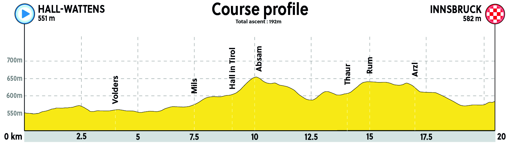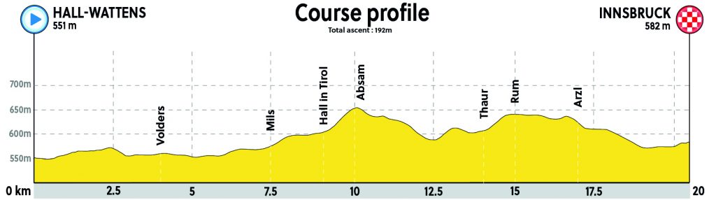 El trazado de la crono constará de 20 kilómetros, con un total de casi 200 metros de desnivel acumulado, que se concentrarán principalmente en la ascensión a Absam, que cuenta con algo más de 2 kilómetros y que se corona justo en el ecuador de la prueba.