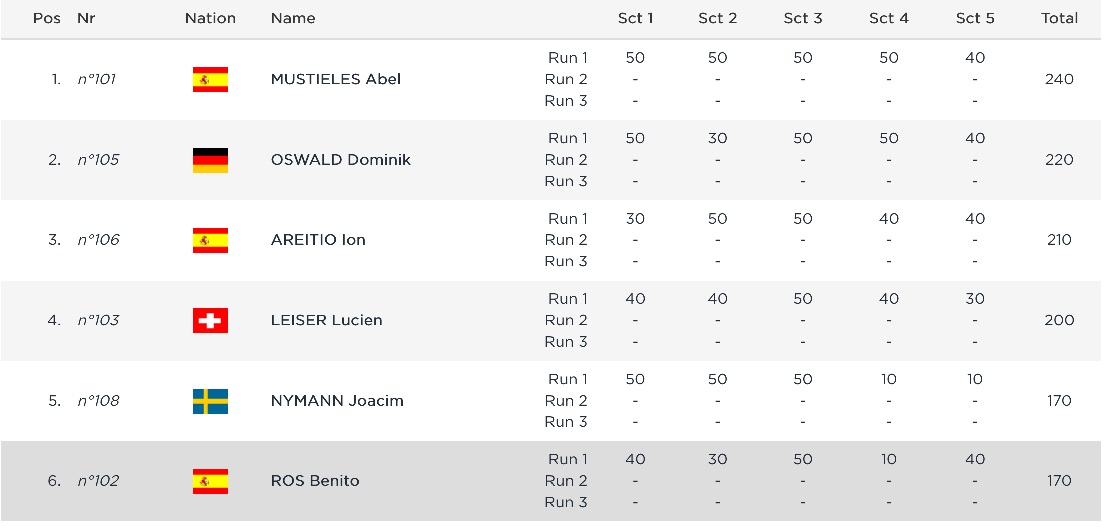 Además del oro del aragonés -que hizo pleno en cuatro de las cinco secciones-, Ion Areitio se colgó el bronce en la prueba reina masculina con el alemán Dominik Oswald en medio de los dos españoles. El tercero en liza, el navarro Benito Ros quedó sexto y último quedándose en puertas de ser el ciclista español más laureado de la historia si llega a lograr su novena presea dorada. Ahora Mustieles -de 26 años y reciente ganador de su quinta Copa del Mundo– empata con Ros y los dos trialeros se convierten en los mejores españoles de siempre, elevando la cifra a 131 arcoíris y 74 en trial, la especialidad con más exitos con diferencia de todas las reconocidas por la UCI.