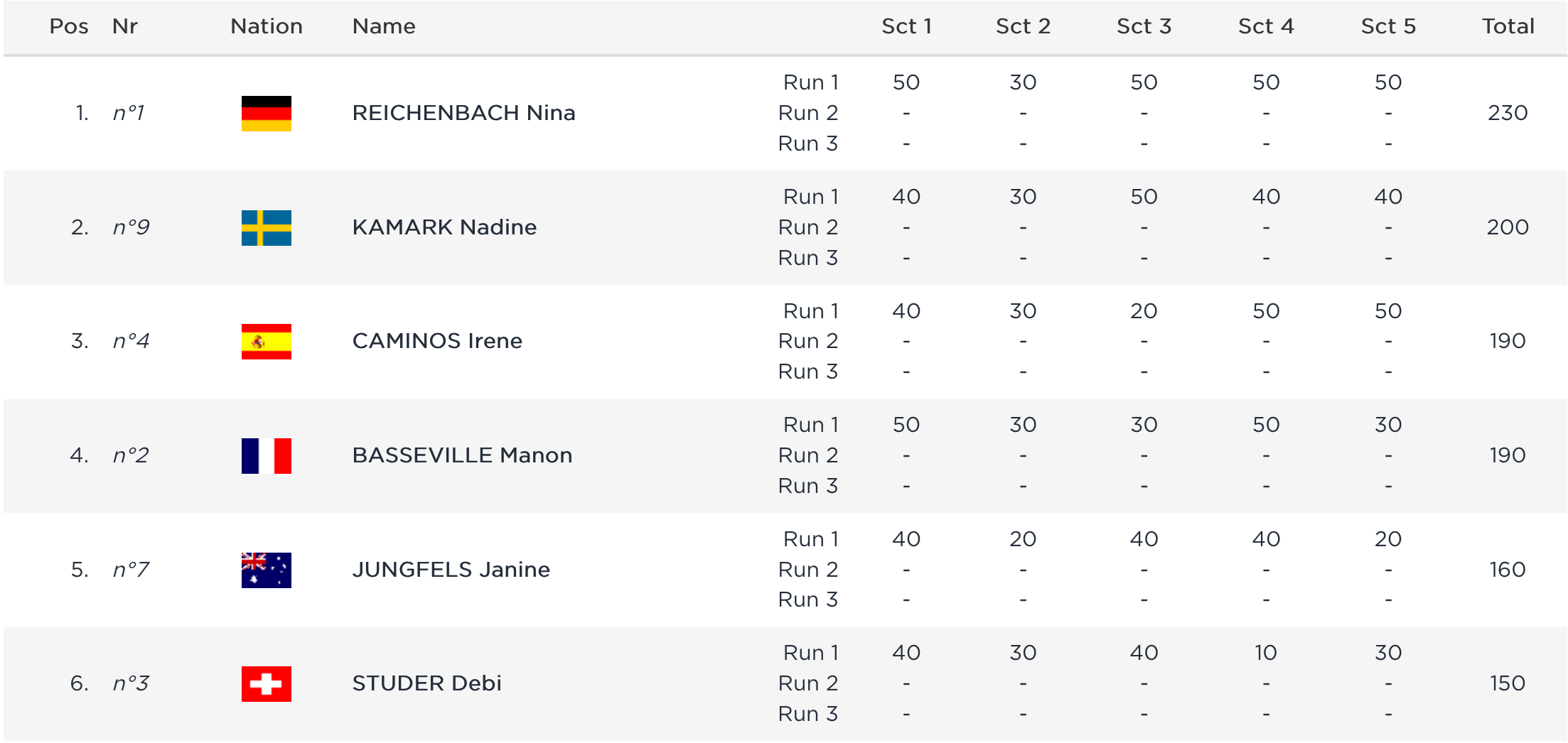 En el turno de las chicas la suerte no ha acompañado a la piloto Alba Hidalgo ya que al quedar octava en la semifinal no se clasifica. Si bien, su compañera Irene Caminos sí diputará la final al obtener hoy una quinta plaza empatada a puntos con la cuarta, la sueca Nadine Kamark. Caminos comenzaba una primera vuelta algo floja pero logró remontar en la segunda y tercera lo que le lleva a colarse entre las mejores.