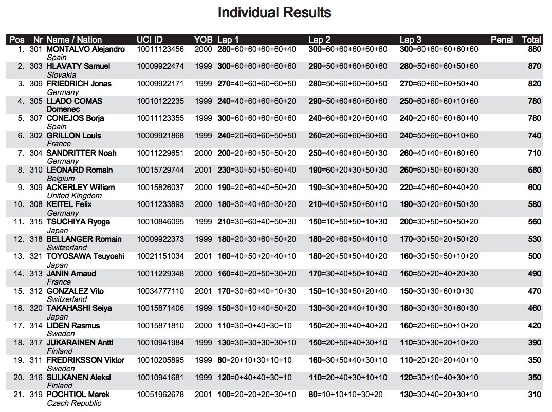 El 130º lo firmó horas antes Montalvo, el toledano de Gerindote -de primer año (2000), sucediendo en el palmarés a Eloi Palau, campeón júnior el año pasado en Vermiglio‐Val di Sole (Italia). La actuación española en la categoría se completó con el bronce del catalán Domènec Lladó, por detrás del francés Louis Grillon, y el madrileño Borja Conejos, sexto y último de los seis finalistas.