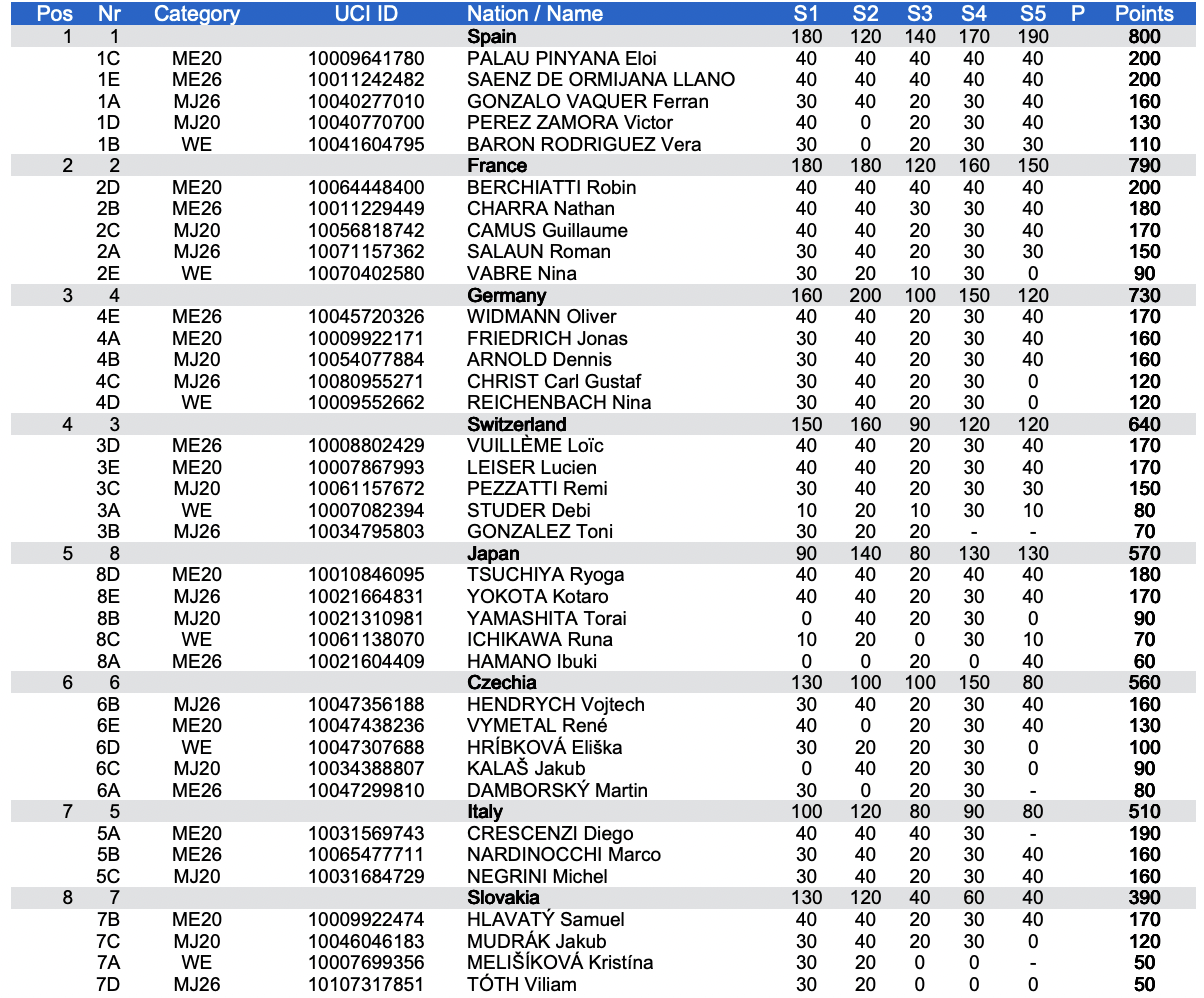 En las semifinales élite 26”, la Selección Española ha clasificado a sus tres representantes para la final por las medallas del sábado. Julen Saénz de Ormijana ha sido 3º con 810 puntos, por detrás de los británicos Jack Carthy (870 puntos) y Charlie Rolls (850 puntos); mientras que Daniel Barón ha logrado el pase con la 4ª mejor puntuación (790 puntos). La 6ª y última plaza que daba acceso a la final ha sido para Martí Vayreda, que ha sumado 750 puntos.