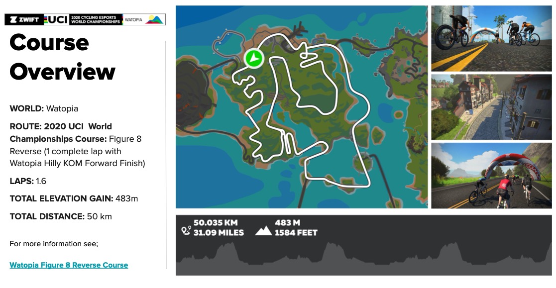 La carrera se disputará sobre 50 kilómetros en el escenario Watopia y situará su línea de meta en la cima del Hilly KOM, siendo el mismo recorrido y distancia para las pruebas masculina y femenina.