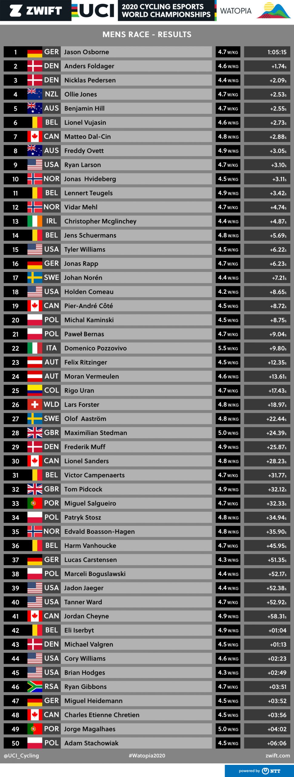 La carrera masculina, de 50 kms y 4 ascensiones al puerto de Watopia, estuvo marcada por un ritmo sostenido con marcaje cerrado hasta los últimos 900 metros de la misma, en donde se iniciaba la selectiva y empinada subida rumbo a meta. Nombres conocidos del pelotón profesional como Rigoberto Urán, Domenico Pozzovivo o Victor Campenaerts se vieron sorprendidos por Osborne; un remero olímpico ganador de una plata como parte del equipo alemán en el cuádruple scull masculino ligero en el Campeonato Mundial de Remo 2013 en Chungju, Corea y representando a su país en la misma modalidad de scull en los Juegos Olímpicos de Verano de Río de Janeiro en 2016, en ciclismo solo se le conocían dos top10 en el campeonato nacional germano de fondo en carretera; quien con un fuerte ataque a 500 metros del final dejó sentenciada la prueba para cruzar la meta en solitario demostrando su superioridad desde el rodillo. Compartiendo podio la pareja de daneses Anders Foldager (2º y amateur también) y Nicklas Pedersen (3º, exprofesional desde 2019).