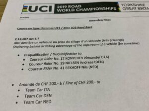 Mundial marcado por una decisión arbitral. Los miembros del jurado técnico nombrados por la UCI decidieron momentos antes de la ceremonia de entrega de medallas descalificar al neerlandés Nils Eekhoff revisando los vídeos de la carrera. Eekhoff, quien cruzó en primer lugar la meta en la prueba en línea sub23 se le acusó con acierto de haber realizado una maniobra común pero ilegal: trascoche tras una caída masiva en la que incluso se le dislocó un hombro.