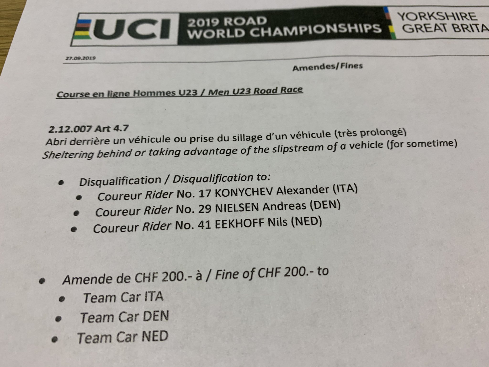 La propia UCI, en un ejercicio de esclarecer la decisión, dio más luz sobre la descalificación de Eekhoff aludiendo como causa de su sanción el posicionarse detrás de un vehículo (4.7 del artículo 2.12.007) durante más de 2 minutos. El castigo máximo previsto por el artículo se consideró apropiada debido al tiempo dedicado a su acción y la decisión fue tomada por los comisarios después de la carrera basada en imágenes de una cámara de moto disponibles para la revisión posterior. Los jueces de la carrera revisaron las imágenes y siguieron el debido proceso escuchando al ciclista y al equipo antes de tomar la decisión.