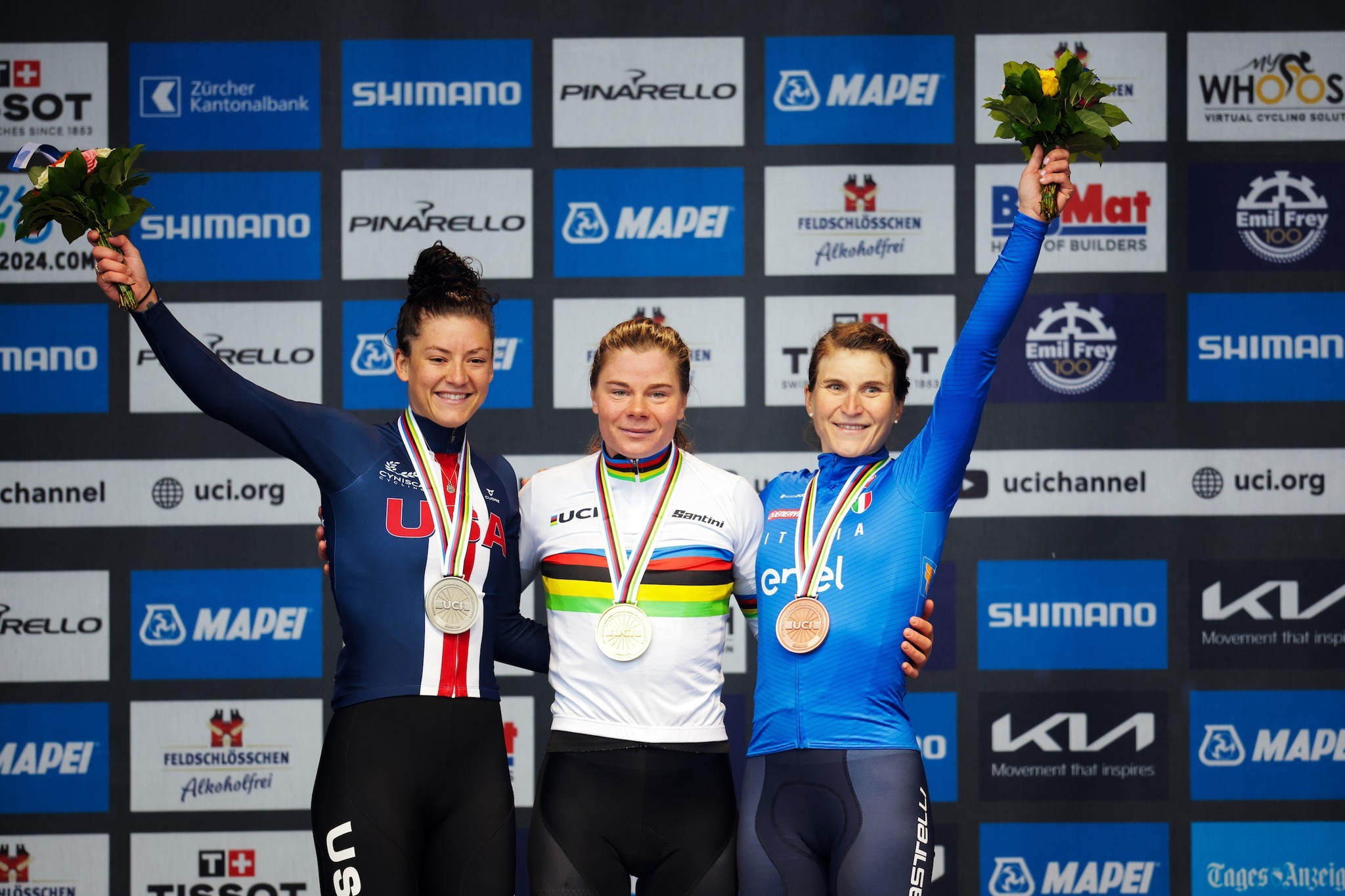 Lotte Kopecky se proclamó bicampeona del mundo en Zúrich, enlazando este título con el conseguido en 2023 en Glasgow, y volverá a vestir el maillot arcoíris la próxima temporada. La selección belga se impuso a la neerlandesa, en la que Demi Vollering no supo seguir una táctica de equipo correcta, lanzando ataques que únicamente eliminaron a sus compatriotas en la parte decisiva del circuito. Tras una jornada de mucha dureza, nuevamente bajo una intensa lluvia, todo se acabó decidiendo en un sprint a seis bandas. La medalla de plata fue para la estadounidense Chloé Dygert, que recuperó las buenas sensaciones de años previos, pero que terminó con evidentes signos de dolor en la misma rodilla de la que fue operada tras la grave caída sufrida en 2020. El bronce recayó sobre Elisa Longo Borghini, que siempre da la cara con ataques lejanos y que trató de sorprender en la llegada.