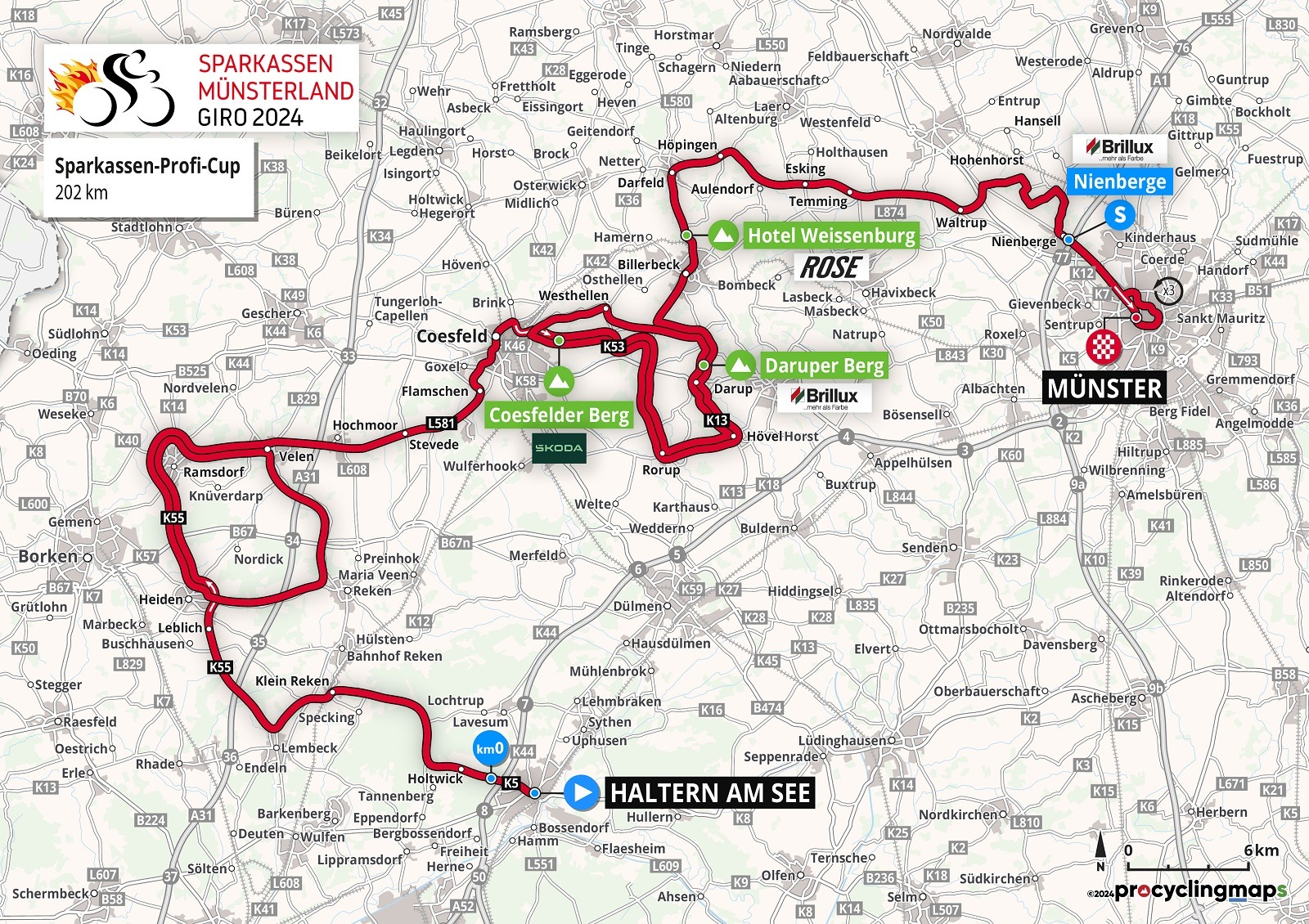 Ningún belga había el Giro de Munsterland en sus 17 ediciones previas y en 2024, tres ciclistas de este país ocuparon las tres plazas del podio. Jasper Philipsen cosechó su novena victoria de la temporada tras batir a Jordi Meeus en un igualado sprint que se decantó en favor del de Alpecin. Tras un buen trabajo de posicionamiento por parte de su equipo, Philipsen se quedó algo encerrado en las últimas curvas y tuvo que buscarse la vida en solitario. Supo ver que la rueda buena era la del tren del Red Bull-Bora y sobrepasó a su compatriota en los metros finales. El podio lo completó Milan Fretin, que cruzó la línea de meta por delante de velocistas como Girmay, Van Poppel o los locales Walscheid y Ackermann.